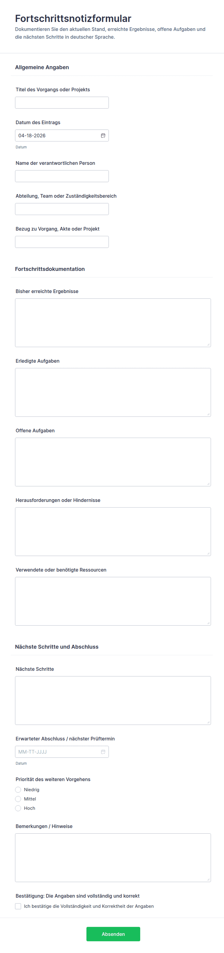 - Der Detaillierungsgrad und die erforderlichen Anhänge (z. B. Fotos, Unterschriften) können je nach Compliance- oder Dokumentationsanforderungen variieren.