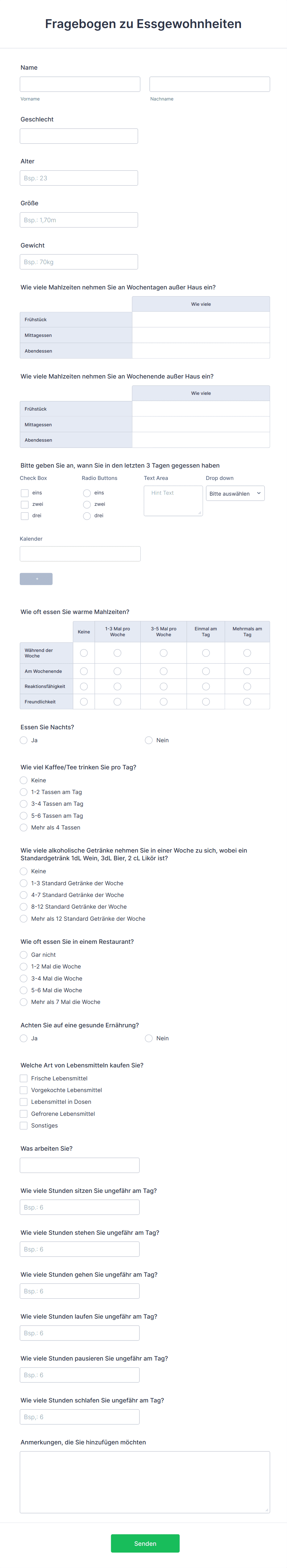 Ein Fragebogen zu gesunden Gewohnheiten ist eine Umfrage, mit der Sie Informationen über die gesunden Gewohnheiten von Personen erfassen können. Ganz gleich, ob Sie Sportlehrer, Gesundheitsdienstleister oder Fitnesstrainer sind, verwenden Sie diesen Fragebogen zu gesunden Gewohnheiten, um zu beurteilen, was Einzelpersonen in Bezug auf ihre Ernährung und Bewegung richtig machen und was verbessert werden muss. Laden Sie einfach Ihr Logo hoch und passen Sie die Fragen an Ihre Bedürfnisse an. Sobald Sie fertig sind, können Sie das Formular auf Ihrer Website einbinden oder einen Link mit anderen teilen.Machen Sie diesen Fragebogen zu gesunden Gewohnheiten zu Ihrem eigenen, indem Sie die Fragen bearbeiten und weitere nach Ihren Bedürfnissen hinzufügen. Wenn Sie die Antworten in Ihre anderen Konten übertragen möchten, können Sie dies mit den über 100 Integrationen von Jotform tun. Wenn Sie möchten, dass Ihre Studenten ihre Antworten auf einem mobilen Gerät senden, laden Sie unsere kostenlose Jotform Mobile Formulare App herunter. Lassen Sie Ihre Mitarbeiter wissen, woran sie arbeiten müssen und motivieren Sie sie mit einem kostenlosen Fragebogen zu gesunden Gewohnheiten zu Veränderungen.