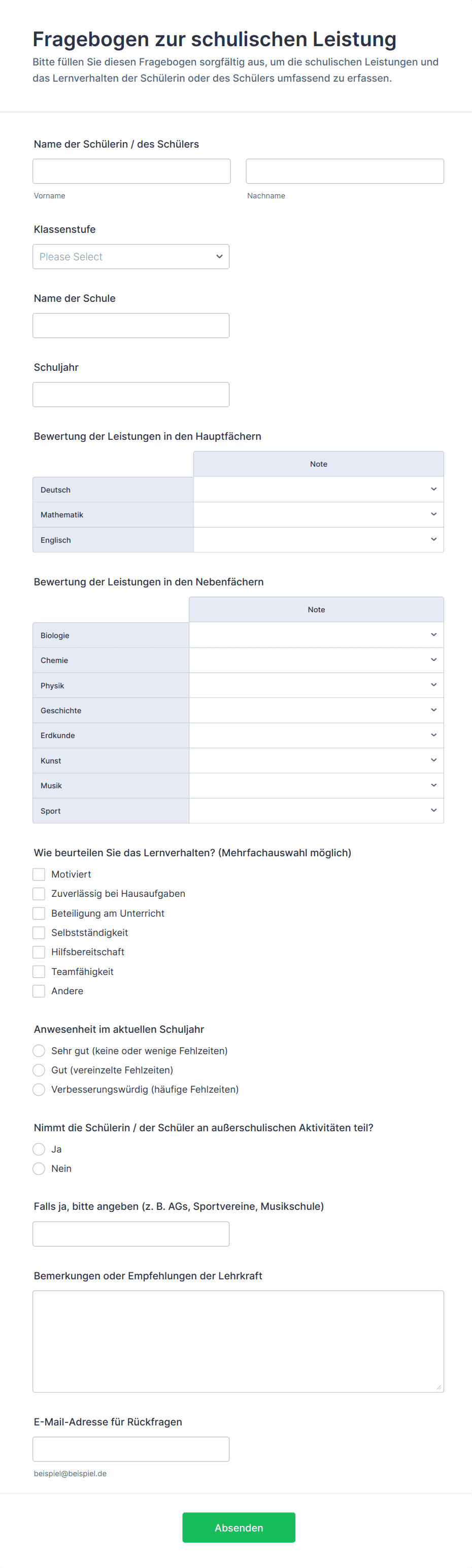 - Inhalt und Felder unterscheiden sich je nach Zielsetzung: So kann beispielsweise ein Fragebogen zur Gesundheitsvorsorge Angaben zur Krankengeschichte und Symptom-Checklisten enthalten, während ein Feedback Formular sich auf Zufriedenheitsbewertungen und offene Kommentare konzentriert.