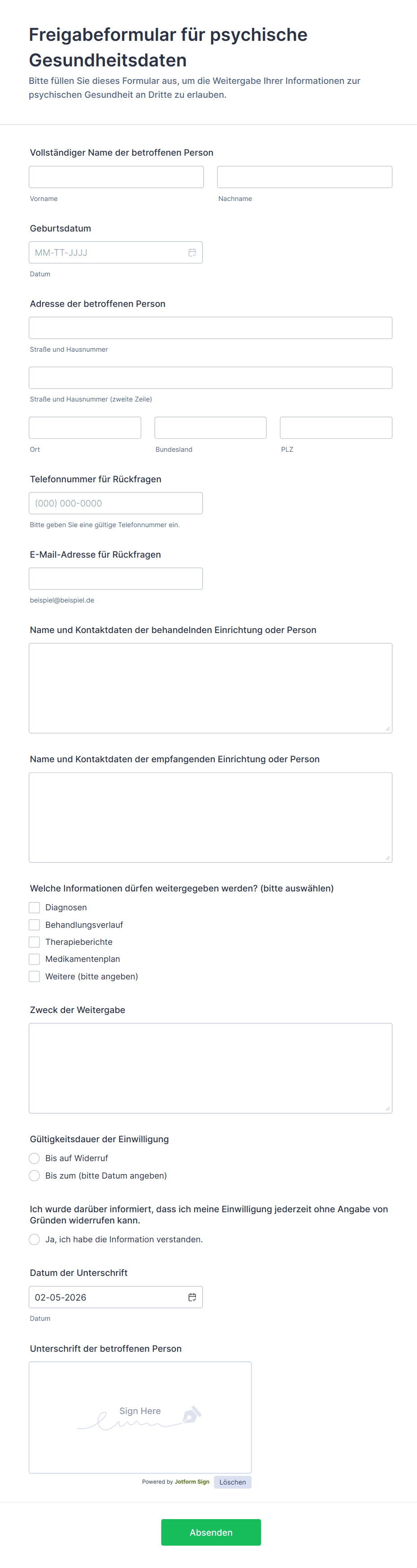 - Formulare für die Einwilligung und den Datenschutz im Bereich der psychischen Gesundheit legen den Schwerpunkt auf informierte Einwilligungsbestätigungen, Vertraulichkeitsgrenzen, Kommunikationspräferenzen und erforderliche Bestätigungen.