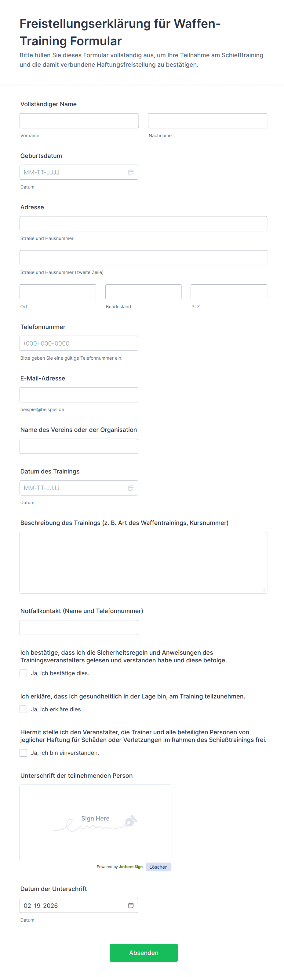 - Haftungsausschlusserklärungen für Sport- und Freizeitaktivitäten nennen Risiken, beschränken die Haftung, verweisen auf Sicherheitsregeln und verlangen oft eine elektronische Signatur.