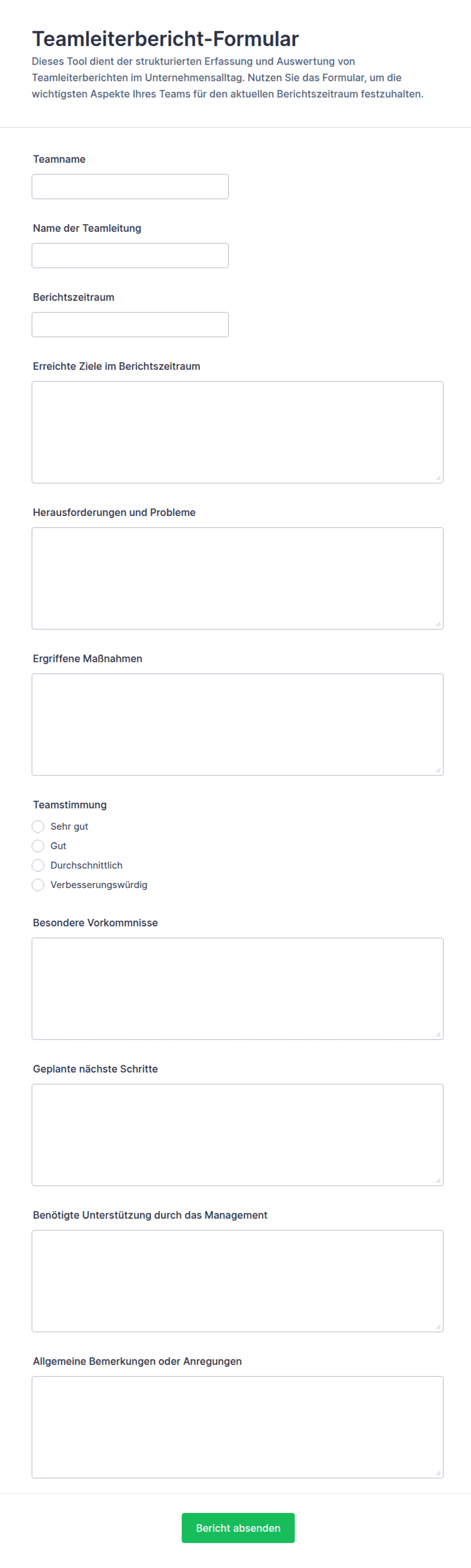 Ein Geschäftsberichtsformular ist ein strukturiertes Dokument zur Erfassung und Präsentation von Informationen über verschiedene Geschäftsaktivitäten wie Finanzergebnisse, Projektfortschritte, Vorfälle oder Mitarbeiterbeurteilungen.