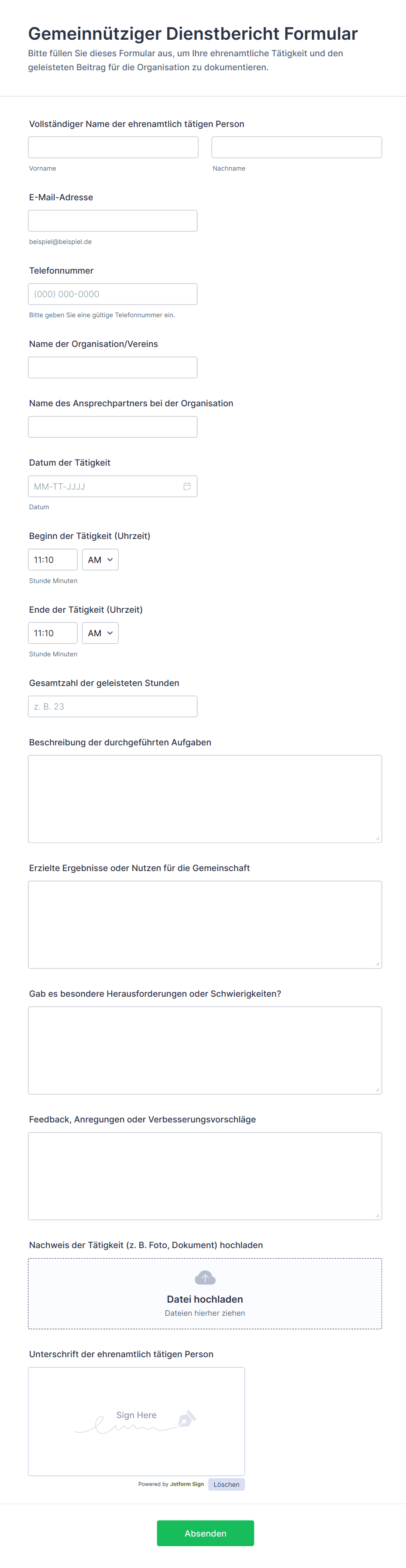 Gemeinnütziger Dienstbericht Formular erleichtert Vereinen und Initiativen die Datenerfassung zu ehrenamtlichen Einsätzen, damit Tätigkeiten, Stunden und Rückmeldungen zentral gesammelt und als Formularantworten in Jotform verwaltet werden.