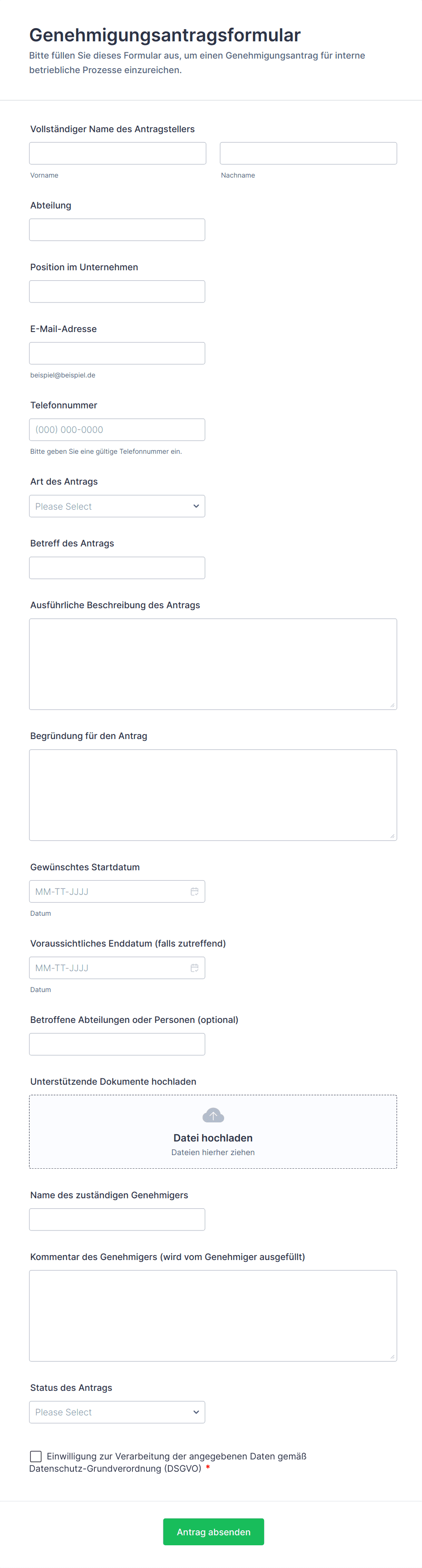Eine Genehmigungsformularvorlage ist ein vorgefertigtes Online-Formular, das den Prozess der Einreichung, Überprüfung und Genehmigung von Anfragen innerhalb eines Unternehmens erleichtert. Es standardisiert den Workflow und stellt sicher, dass alle erforderlichen Informationen erfasst und an die richtigen Personen weitergeleitet werden.