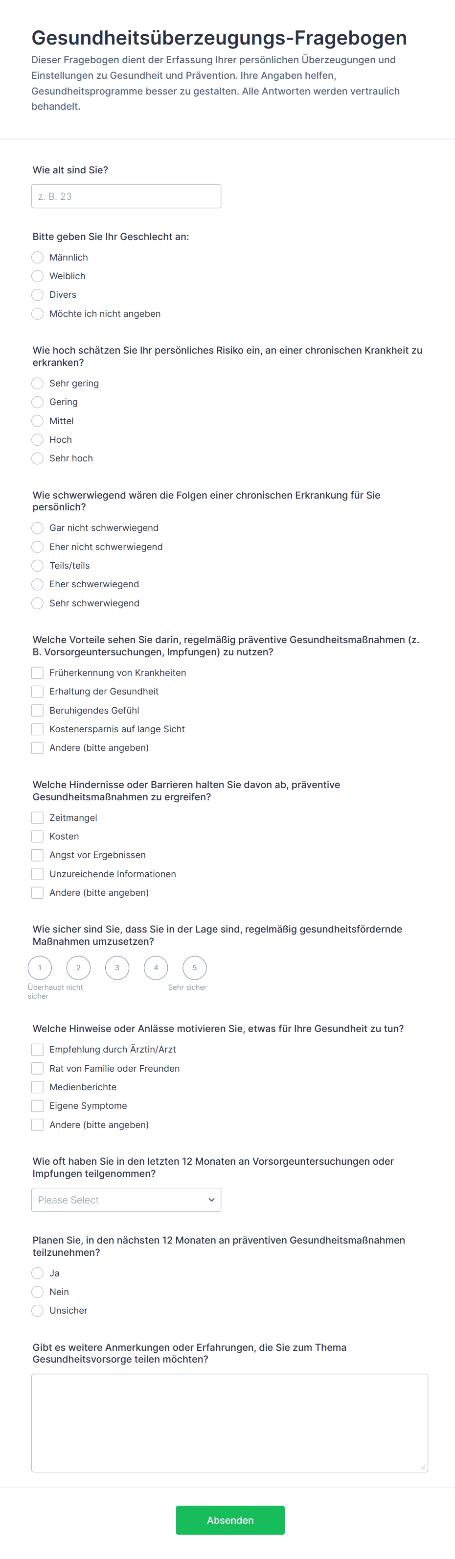 - Inhalt und Felder unterscheiden sich je nach Zielsetzung: So kann beispielsweise ein Fragebogen zur Gesundheitsvorsorge Angaben zur Krankengeschichte und Symptom-Checklisten enthalten, während ein Feedback Formular sich auf Zufriedenheitsbewertungen und offene Kommentare konzentriert.
