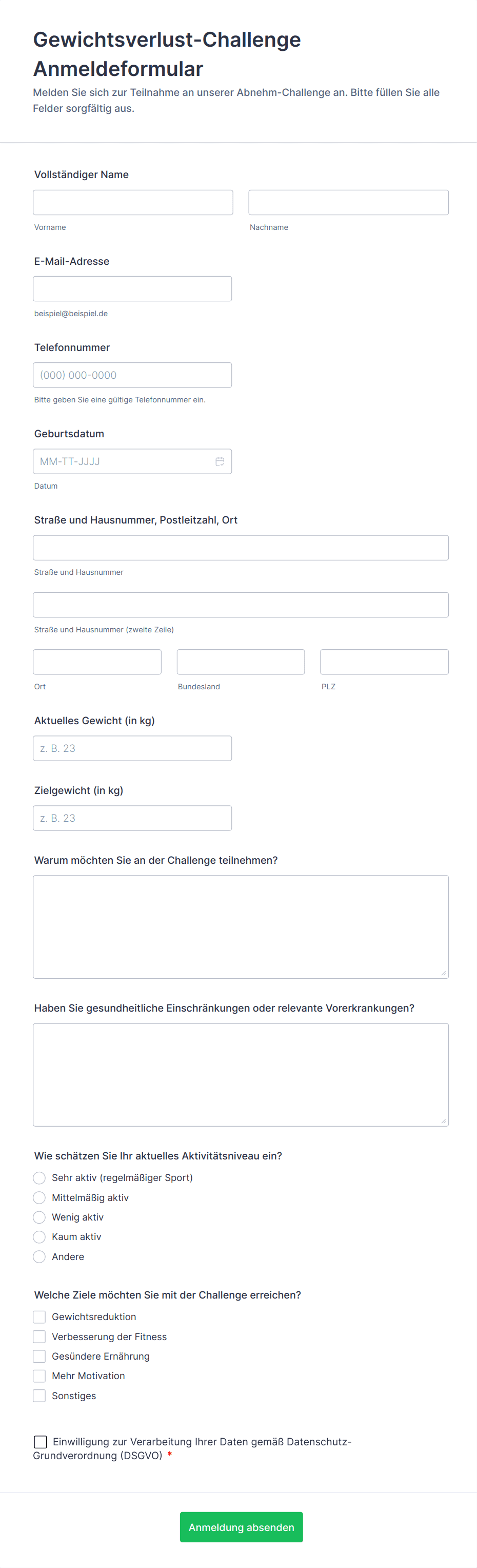Wellness-Formulare sind digitale Tools, die Informationen zu Gesundheit, Wohlbefinden und Lebensgewohnheiten erfassen, verfolgen und verwalten. Viele nutzen sie — Wellness-Coaches, Fitnesstrainer, Gesundheitsdienstleister, betriebliche Wellness-Programme und Privatpersonen —, um Ernährung, Trainingsroutinen, psychische Gesundheit, Schlafgewohnheiten und Stresslevel zu überwachen. Sie dienen für Gesundheitsbewertungen, tägliche Check-ins, Zielverfolgung, Einholung von Einwilligungen und Feedback-Erfassung. Dank ihrer Flexibilität setzen Sie Wellness-Formulare in Fitnessstudios, Kliniken, Schulen, am Arbeitsplatz oder in Wellness-Retreats ein und bleiben so stets informiert und proaktiv in Sachen Gesundheit und Wellness.