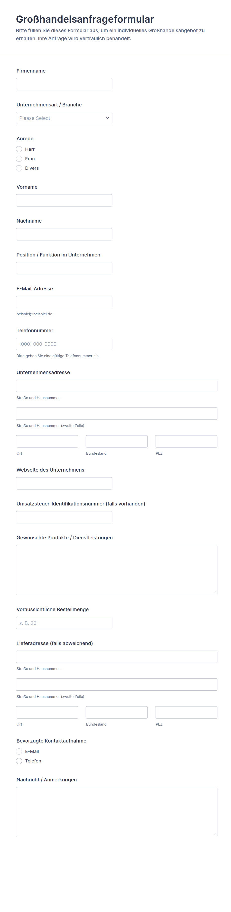 - Für Vertriebsanfragen: Firmenname, Kontaktdaten, Produkt-/Serviceinteresse, Budget, Zeitrahmen