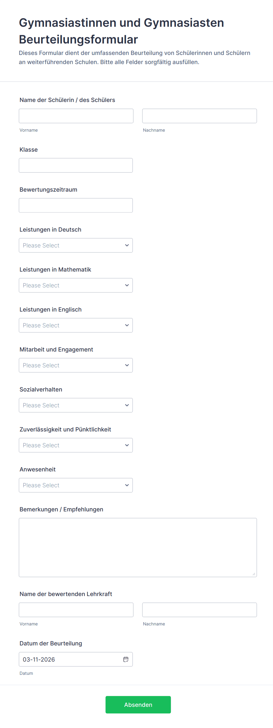 Gymnasiastinnen und Gymnasiasten Beurteilungsformular für Lehrkräfte zur digitalen Datenerfassung von Leistungs- und Verhaltensbewertungen im Schulalltag, basierend auf einer anpassbaren Formularvorlage in Jotform.