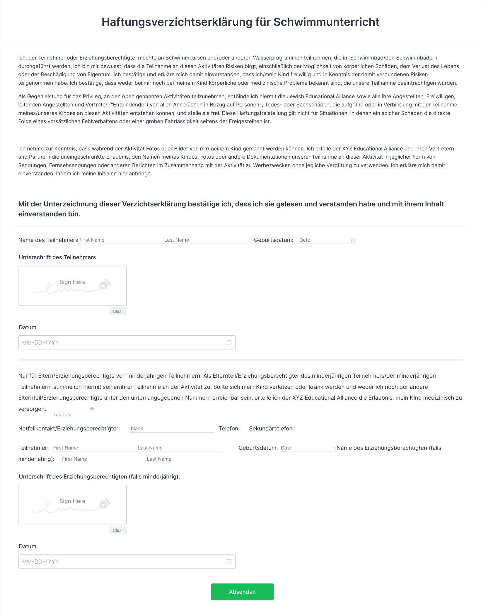 Einverständniserklärungen sind wichtige Dokumente, mit denen die ausdrückliche Zustimmung von Personen eingeholt wird, bevor Aktivitäten durchgeführt werden, die die Erfassung personenbezogener Daten, medizinische Verfahren, die Teilnahme an Forschungsprojekten, Fotoaufnahmen oder andere sensible Handlungen umfassen. Diese Formulare dienen als rechtliche und ethische Absicherung und stellen sicher, dass die Teilnehmer umfassend über ihre Verpflichtungen informiert sind und ihre Rechte gewahrt bleiben. Einverständniserklärungen werden häufig im Gesundheitswesen, im Bildungswesen, in der Forschung, im Veranstaltungsmanagement und in Unternehmen verwendet, in denen Transparenz und die Einhaltung von Vorschriften, wie beispielsweise der DSGVO oder HIPAA, von entscheidender Bedeutung sind.