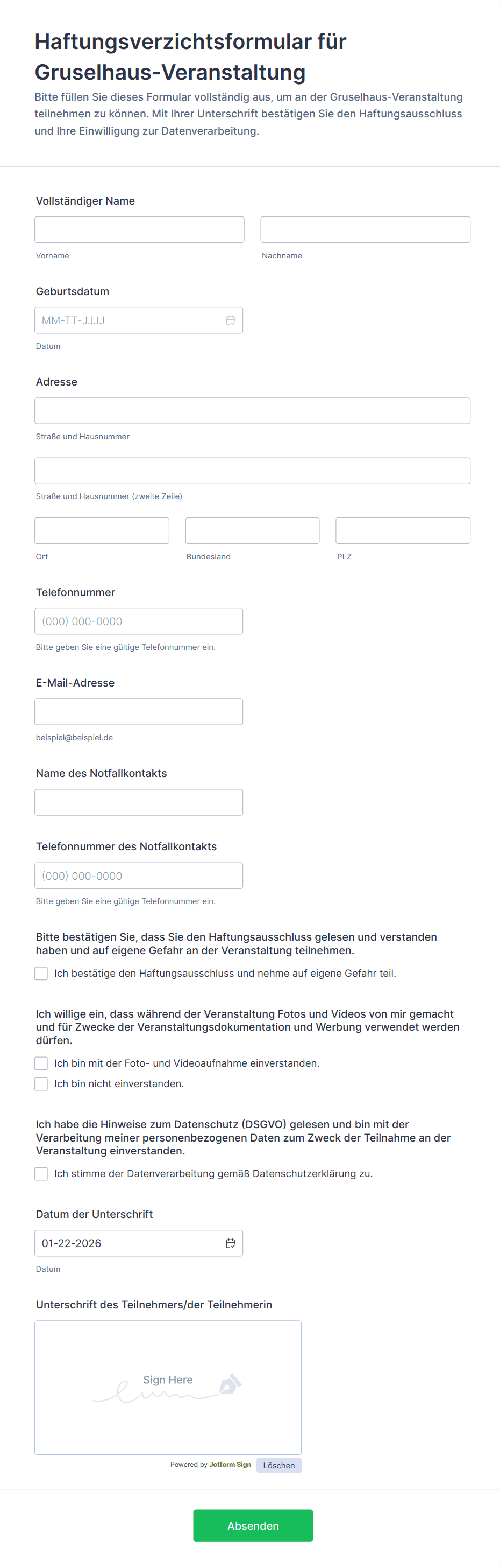 Mit Jotform wird das Erstellen und Verwalten von Haftungsausschlüssen zu einem nahtlosen, effizienten Prozess. Mit dem No-Code Drag-and-Drop Formulargenerator von Jotform können Benutzer schnell Haftungsausschlüsse anpassen, Vorlagen oder Formulare ganz neu erstellen und wichtige Felder wie Teilnehmerinformationen, digitale Signaturen und Zustimmungs-Checkboxen hinzufügen. Die automatische Datenspeicherung, Echtzeitbenachrichtigungen und die Integration mit anderen Tools optimieren die Erfassung und Verwaltung von unterzeichneten Verzichtserklärungen. Ganz gleich, ob Sie Kleinunternehmer, Veranstaltungsorganisator oder Gesundheitsdienstleister sind – mit Jotform können Sie online rechtsgültige Haftungsausschlüsse einholen, Papierarbeit reduzieren und Compliance mühelos sicherstellen.