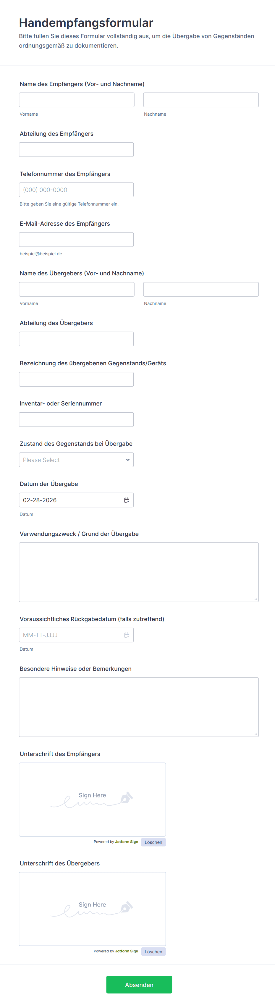 - Geräteausgabe/-rücknahme: Formulare können Felder für Asset-ID, Benutzername, Ausgabe-/Rückgabedaten und Zustandsnotizen enthalten.