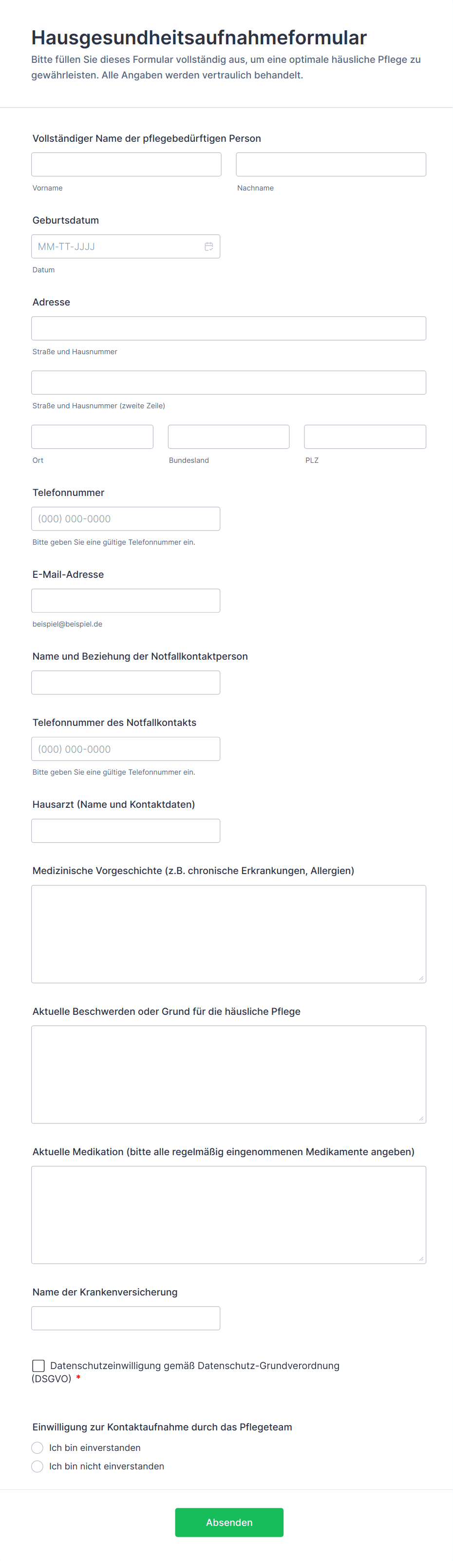 - Aufnahmeformulare im Gesundheitswesen können Felder für Krankengeschichte, Allergien und Versicherung erfordern.