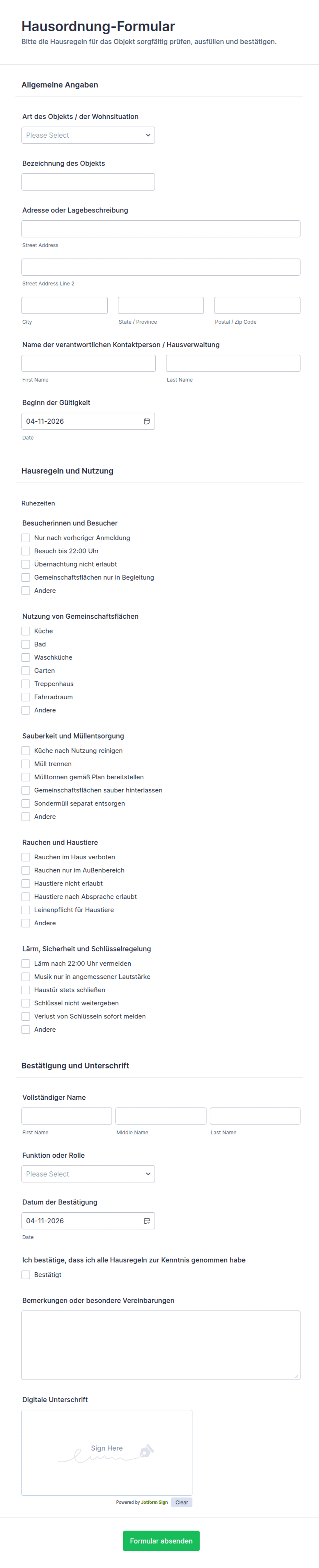 Mit Jotform erstellen, passen und verwalten Sie Online-Formulare für die Immobilienverwaltung — ganz ohne Programmierkenntnisse. Der intuitive Drag-and-Drop-Formulargenerator und die umfangreiche Vorlagenbibliothek ermöglichen es Ihnen, Daten nahtlos zu erfassen und zu organisieren. Automatisieren Sie Benachrichtigungen, akzeptieren Sie Zahlungen online und speichern Sie Antworten sicher, um Aufgaben von der Mieteraufnahme bis zur Wartungsverfolgung zu vereinfachen. Durch die Digitalisierung Ihrer Arbeitsabläufe sparen Sie Zeit, reduzieren Papierkram und steigern die Zufriedenheit von Verwaltern und Mietern.