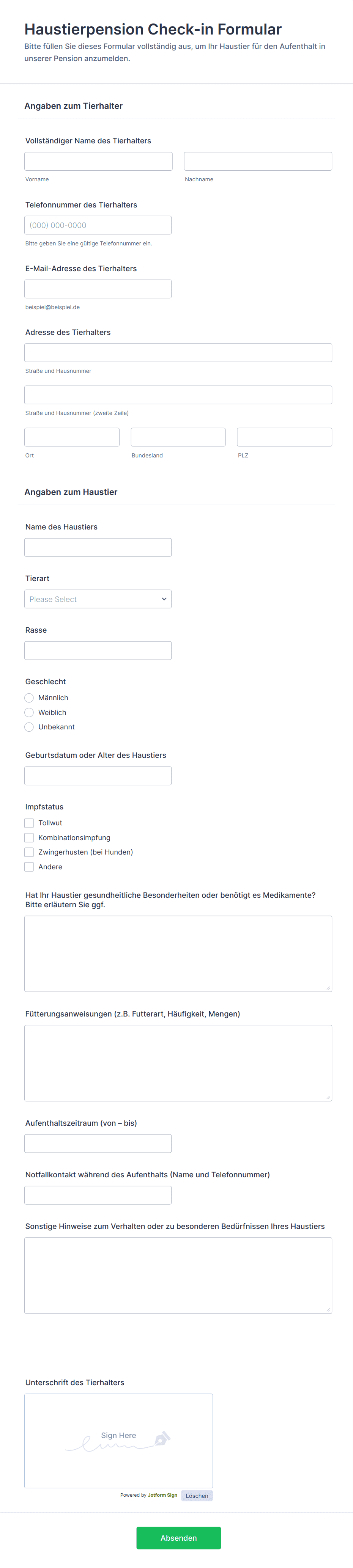 Check-in Formularvorlagen sind digitale Formulare, die den Prozess der Erfassung von Ankünften und Abgängen in verschiedenen Umgebungen wie Veranstaltungen, Terminen, Arbeitsplätzen, Schulen, Hotels und Gesundheitseinrichtungen optimieren. Diese Vorlagen helfen Organisationen, die Anwesenheit effizient zu verfolgen, den Besucherstrom zu überwachen und wichtige Informationen von Gästen, Mitarbeitern oder Teilnehmern zu erfassen. Ganz gleich, ob Sie eine Konferenz verwalten, Patientenbesuche koordinieren oder die tägliche Mitarbeiteranwesenheit überwachen – Check-in Formulare bieten eine strukturierte und professionelle Möglichkeit, Daten zu sammeln und zu organisieren, und gewährleisten so ein reibungsloses und sicheres Check-in-Erlebnis für alle Beteiligten.