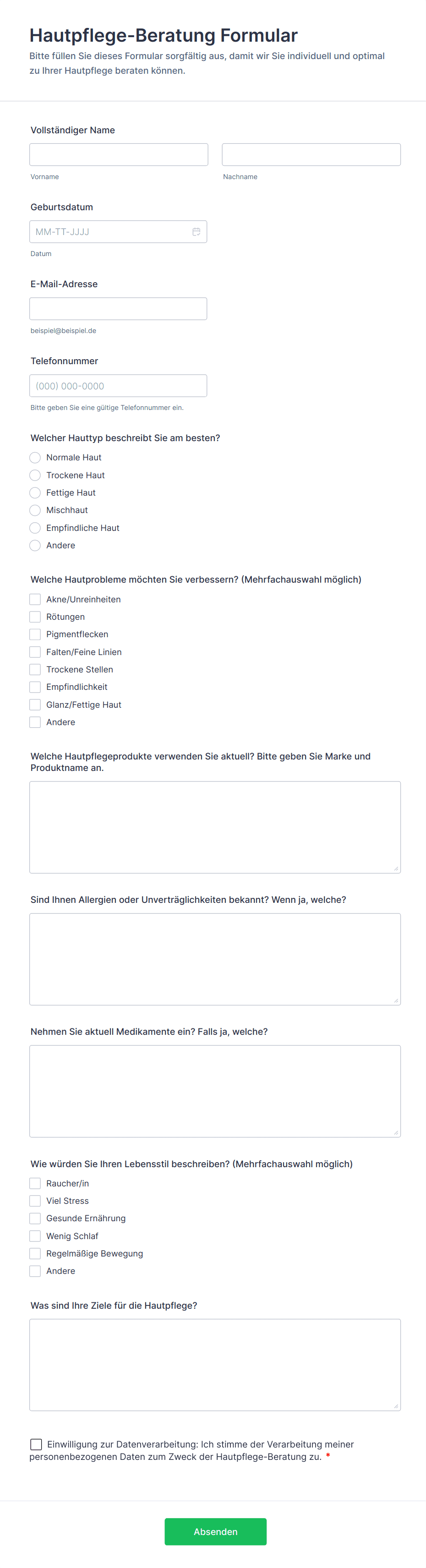 Ein Kosmetikformular ist ein digitales oder gedrucktes Dokument, das von Hautpflegespezialisten verwendet wird, um Kundeninformationen, Einwilligungen, Behandlungsdetails und Feedback zu erfassen. Es hilft dabei, eine sichere, personalisierte und konforme Dienstleistung zu gewährleisten.