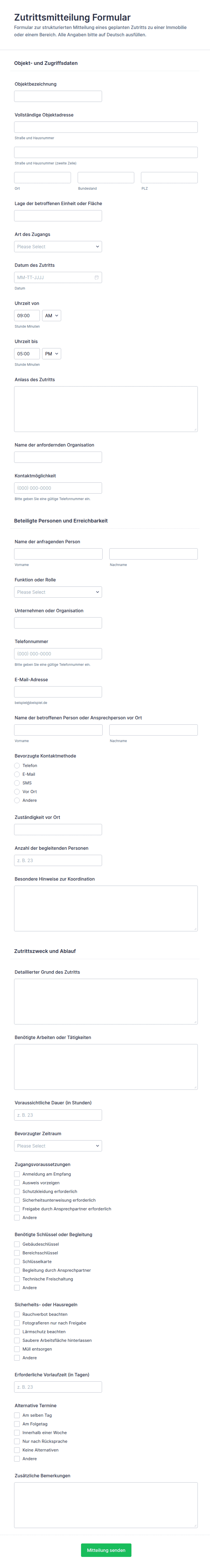 - Formulare für Besucher und temporären Zugang erfassen die Identität des Besuchers, Informationen zum Gastgeber, den Zweck des Besuchs, Datum und Uhrzeit des Eintritts sowie eventuelle Anforderungen zum Einchecken oder zur Begleitung.