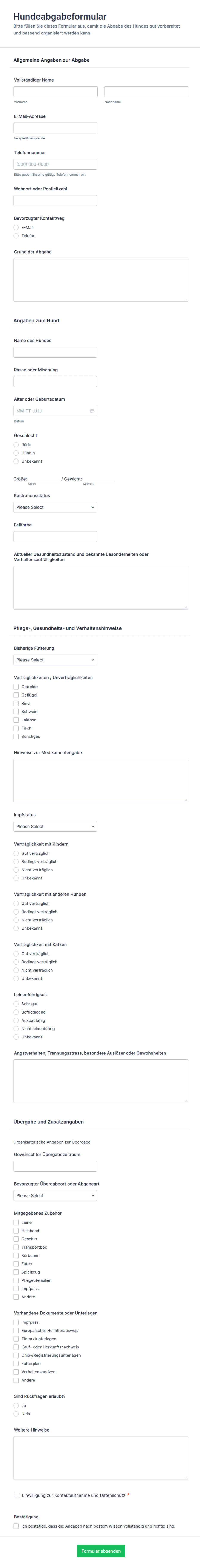 Eine Formularvorlage für Tierheime ist ein vorgefertigtes Online-Formular, mit dem Tierheime und Rettungsorganisationen Informationen für Prozesse wie Adoptionen, Freiwilligenarbeit, Spenden und die Aufnahme von Tieren sammeln und verwalten können.