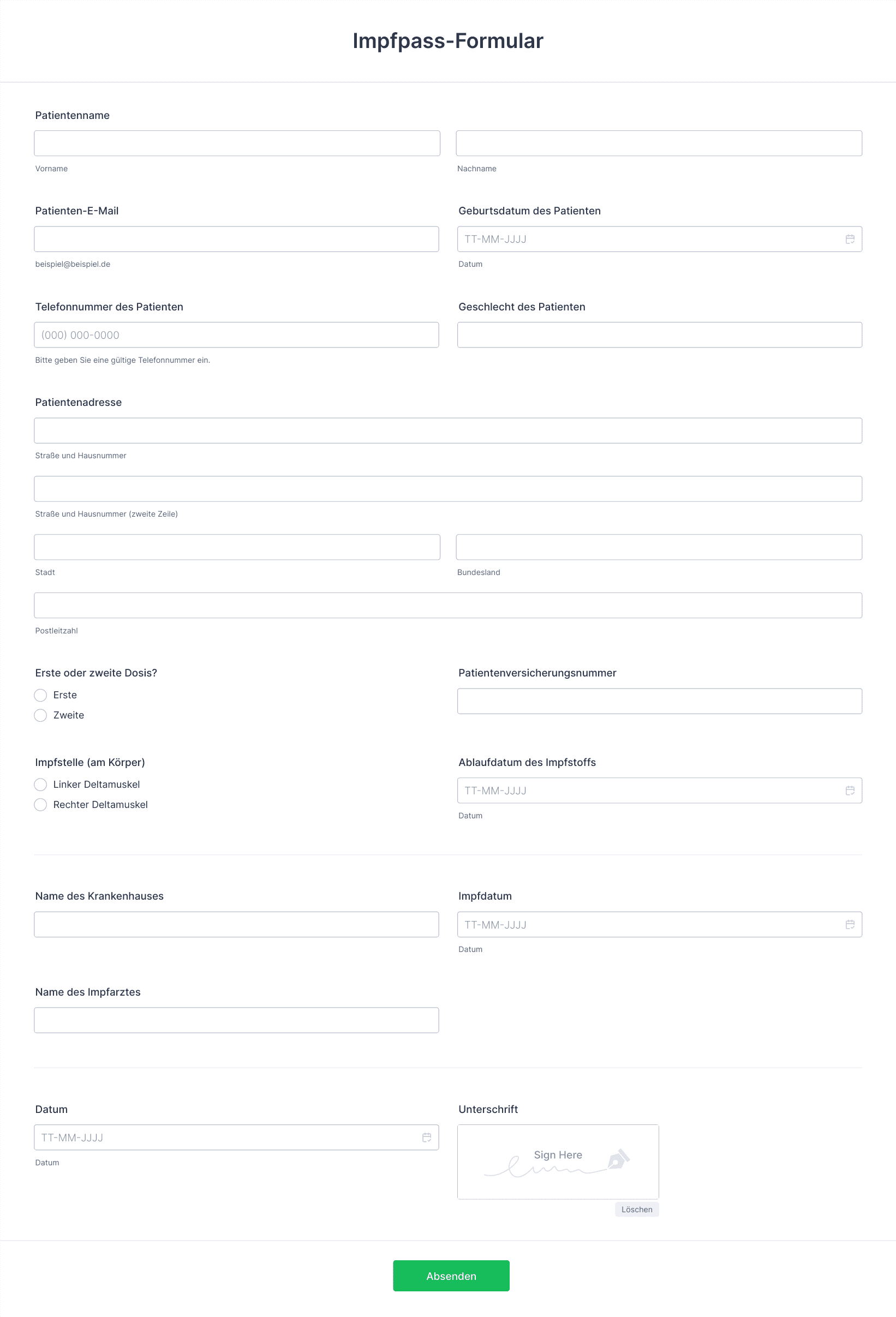 Ein Formular der Patienten Information wird von medizinischen Praxen verwendet, um Informationen zu den jeweiligen Patienten zu erfassen. Verwenden Sie dieses kostenlose Patienten-Informations-Formular, um die Kontaktdaten des Patienten, die Versicherungs-Details oder andere Informationen, die Sie benötigen zu erfassen! Passen Sie das Formular für die von Ihnen benötigten Patienten-Informationen an, betten Sie es auf Ihrer Webseite ein und erhalten Sie Antworten mit den wichtigen Daten Ihrer Patienten. So können sie die Papierflut von Formularen verringern und die Patientendaten sicher speichern. Fügen Sie einfach Ihr Logo ein, laden Sie Fotos hoch, wählen Sie Schriftarten und Farben aus, binden Sie Widgets und bedingte Logik ein und machen Sie Ihr Formular so einfacher auszufüllen und nützlicher. Es sind keine Programmierkenntnisse erforderlich.