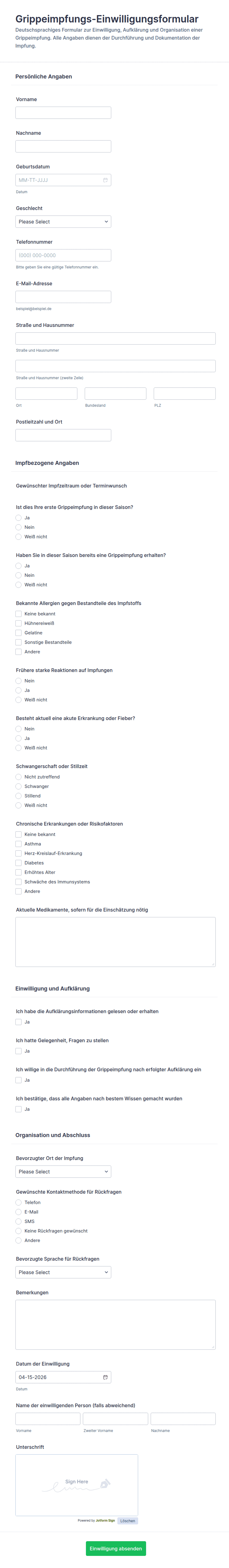 - Felder für die E-Signatur des Patienten und, falls erforderlich, des Erziehungsberechtigten oder Zeugen