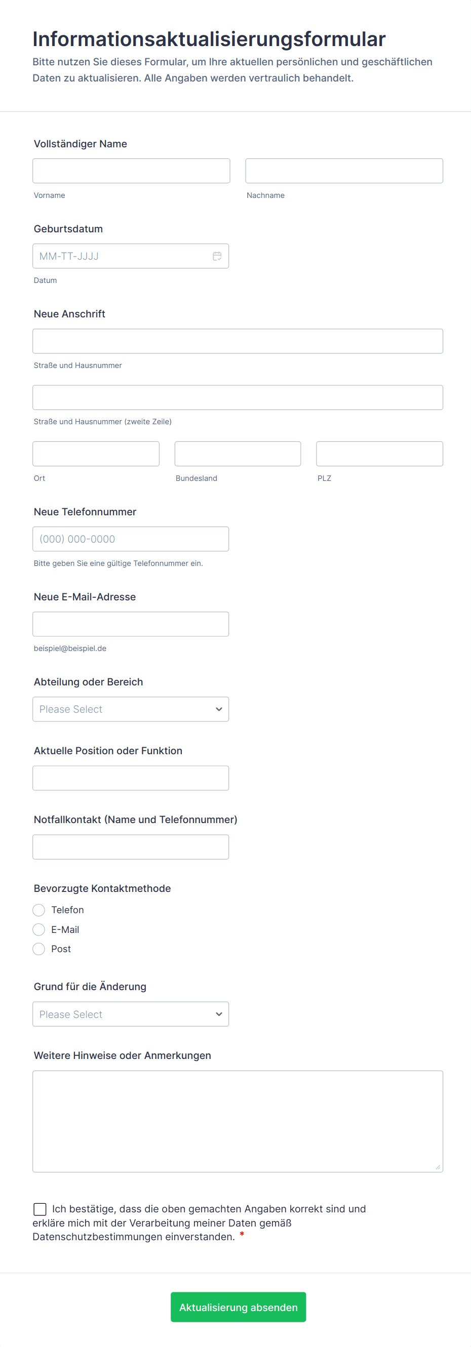 - Kunden Onboarding: Kann Felder für Kontaktdaten, Servicepräferenzen und Einverständniserklärungen enthalten.
