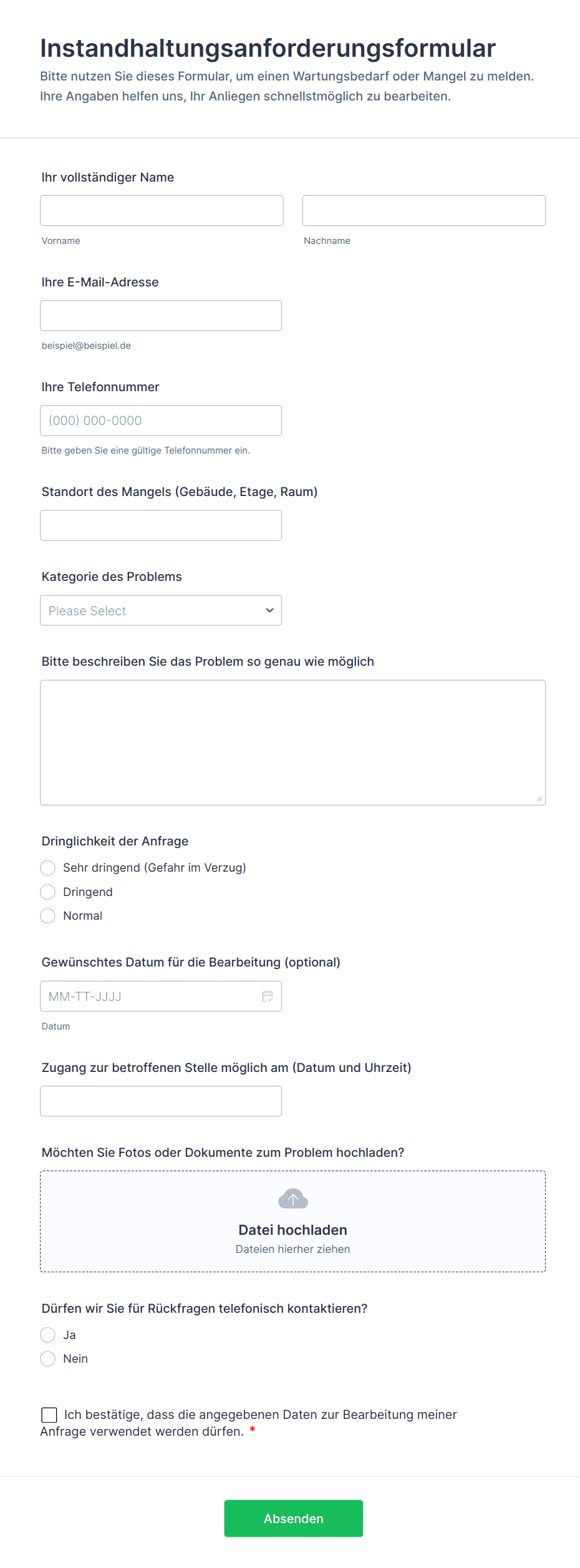 Ein Wartungsformular ist ein Dokument, das von Mietern oder Verwaltern verwendet wird, um Wartungsarbeiten an Immobilien, Gebäuden, Möbeln usw. anzufordern. Wartungsformulare können auch von Wartungsteams verwendet werden, um den Fortschritt eines Projekts zu verfolgen, was die Informationsbeschaffung und den effizienten Abschluss der Arbeiten erleichtert. Mit den kostenlosen Wartungsformularvorlagen von Jotform können Sie das perfekte Formular für Ihre Bedürfnisse erstellen, es anpassen und innerhalb von Minuten freigeben oder einbetten, um den Wartungsprozess schneller und effizienter zu gestalten.