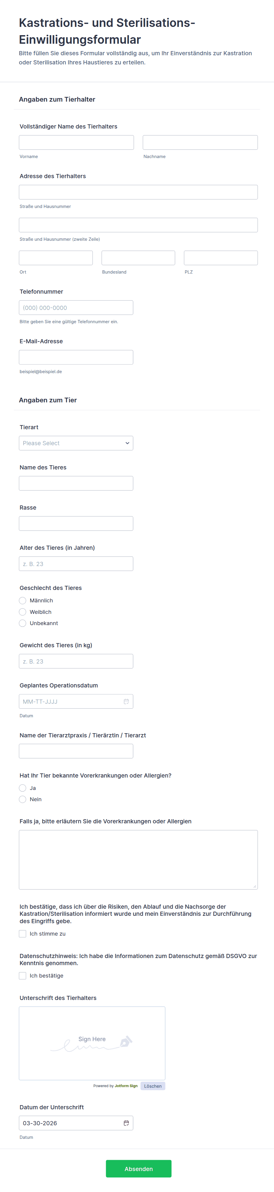 Einverständniserklärungen sind wichtige Dokumente, mit denen die ausdrückliche Zustimmung von Personen eingeholt wird, bevor Aktivitäten durchgeführt werden, die die Erfassung personenbezogener Daten, medizinische Verfahren, die Teilnahme an Forschungsprojekten, Fotoaufnahmen oder andere sensible Handlungen umfassen. Diese Formulare dienen als rechtliche und ethische Absicherung und stellen sicher, dass die Teilnehmer umfassend über ihre Verpflichtungen informiert sind und ihre Rechte gewahrt bleiben. Einverständniserklärungen werden häufig im Gesundheitswesen, im Bildungswesen, in der Forschung, im Veranstaltungsmanagement und in Unternehmen verwendet, in denen Transparenz und die Einhaltung von Vorschriften, wie beispielsweise der DSGVO oder HIPAA, von entscheidender Bedeutung sind.