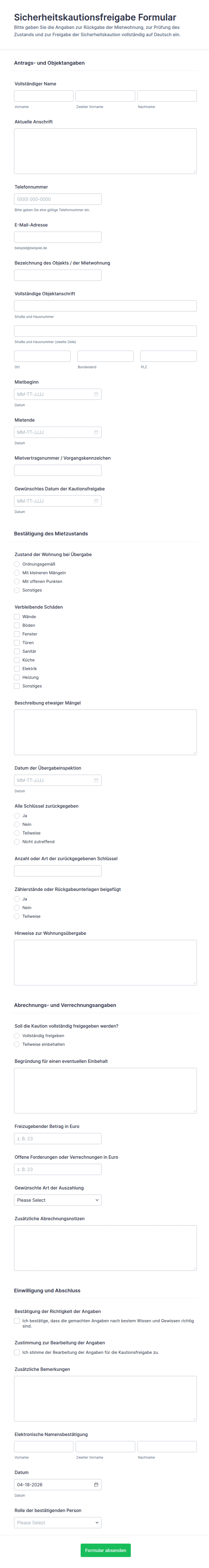 Das Sicherheitskautionsfreigabe Formular erleichtert Vermietern, Hausverwaltungen und Mietern die digitale Datenerfassung zur Kautionsfreigabe nach Auszug, inklusive Dokumentation der Übergabe und Vorbereitung der Auszahlung mit Jotform.