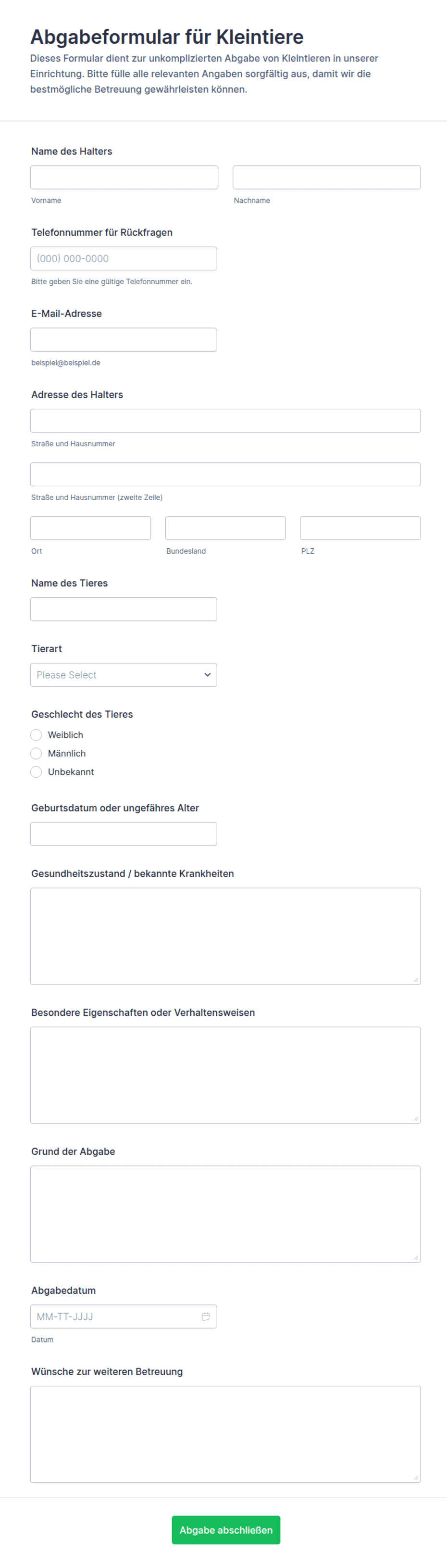 Eine Formularvorlage für Tierheime ist ein vorgefertigtes Online-Formular, mit dem Tierheime und Rettungsorganisationen Informationen für Prozesse wie Adoptionen, Freiwilligenarbeit, Spenden und die Aufnahme von Tieren sammeln und verwalten können.