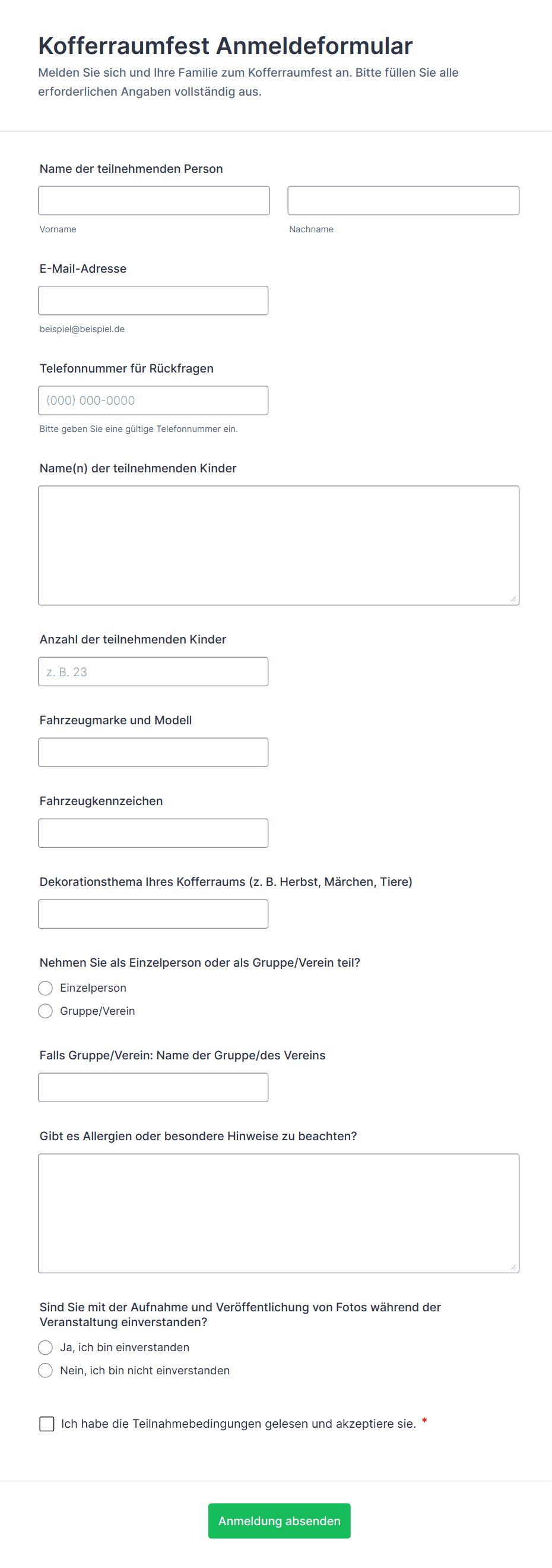 Ein Veranstaltungsanmeldeformular ist ein Online-Formular, mit dem Informationen von Personen erfasst werden, die an einer Veranstaltung teilnehmen möchten. In der Regel werden dabei Angaben wie Namen, Kontaktdaten, Zahlungspräferenzen und besondere Anforderungen erfasst.