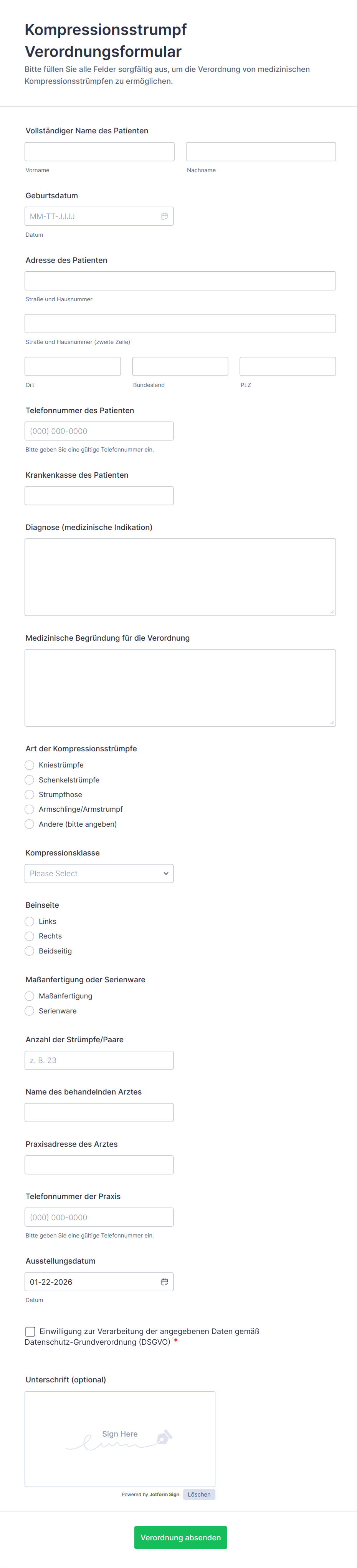 Unsere umfangreiche Auswahl an Online-Formularvorlagen im Gesundheitswesen vereinfacht das Registrierungsverfahren für neue Patienten sowie die Erfassung ihrer Patientenakte. Der Online-Formulargenerator von Jotform bietet Ärzten eine Vielzahl von Widgets, Anwendungen und Designs, um die Patienteneinbindung zu optimieren und die Kommunikation zwischen Patienten und Anbietern zu verbessern. Dies trägt dazu bei, Patienten und ihre individuellen Bedürfnisse besser zu verstehen und eine effektivere Behandlung zu gewährleisten.