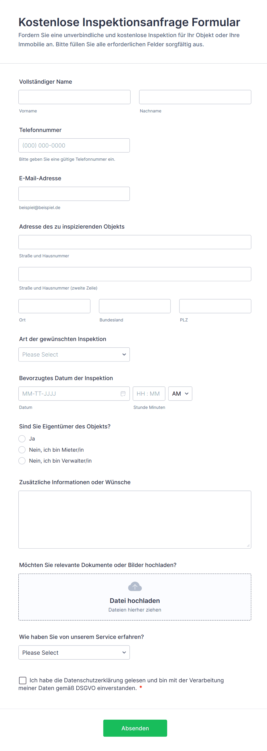 Ein Immobilienzustandsbericht ist ein Dokument, das dazu dient, den Zustand einer Immobilie zu bewerten und zu dokumentieren, in der Regel vor oder nach einem Mietvertrag oder einer Mietperiode. Er ist ein unverzichtbares Instrument für verschiedene Beteiligte, die an Immobilientransaktionen, Verwaltung und Instandhaltung beteiligt sind. Immobilienverwalter, Vermieter und Immobilienmakler können von der Vorlage für den Immobilienzustandsbericht profitieren. Mit diesem Formular können sie den Zustand einer Immobilie genau erfassen, einschließlich aller Schäden, erforderlichen Reparaturen oder Wartungsprobleme. Dieses Formular trägt dazu bei, Transparenz und Verantwortlichkeit zwischen den Parteien zu gewährleisten und Streitigkeiten und Missverständnisse in der Zukunft zu vermeiden. Es dient auch als Referenz für Immobilieninspektionen und kann bei Bedarf als Beweismittel in Gerichtsverfahren verwendet werden.Jotform bietet einen benutzerfreundlichen Formulargenerator, mit dem Sie die Vorlage für den Immobilienzustandsbericht an Ihre speziellen Anforderungen anpassen können. Mit der Drag & Oberfläche von Jotform können Nutzer Felder hinzufügen oder entfernen, Bilder oder Anhänge einfügen und ein nahtloses Ausfüllen des Formulars ermöglichen. Jotform bietet auch die Möglichkeit der elektronischen Unterschrift, so dass Sie bequem Unterschriften von allen beteiligten Parteien einholen können. Dank der umfangreichen Integrationsmöglichkeiten von Jotform können Sie Daten problemlos auf andere Plattformen wie Google Tabellen übertragen oder Arbeitsabläufe mit beliebten Anwendungen wie Salesforce oder Dropbox automatisieren. Vereinfachen Sie die Bewertung des Zustands Ihrer Immobilien mit der Formularvorlage für den Zustandsbericht von Jotform.