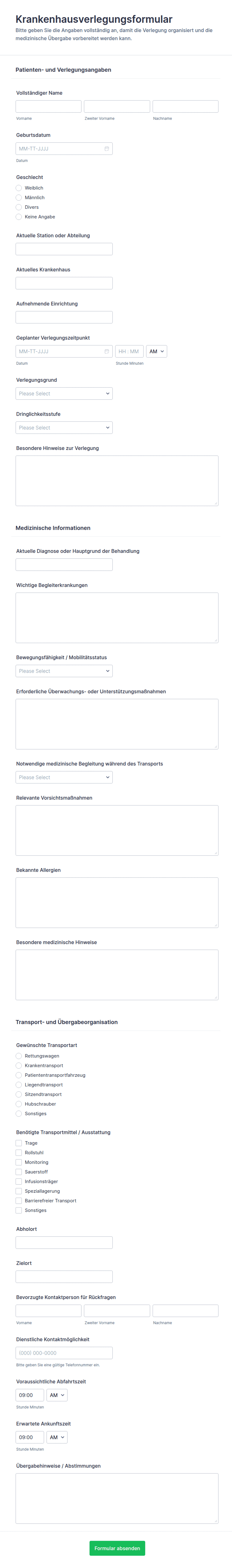 - Formulare für Krankentransporte: Sie brauchen Angaben zum Patienten, zu seiner Mobilität, zu seiner Versicherung und zum gewünschten Fahrzeugtyp.