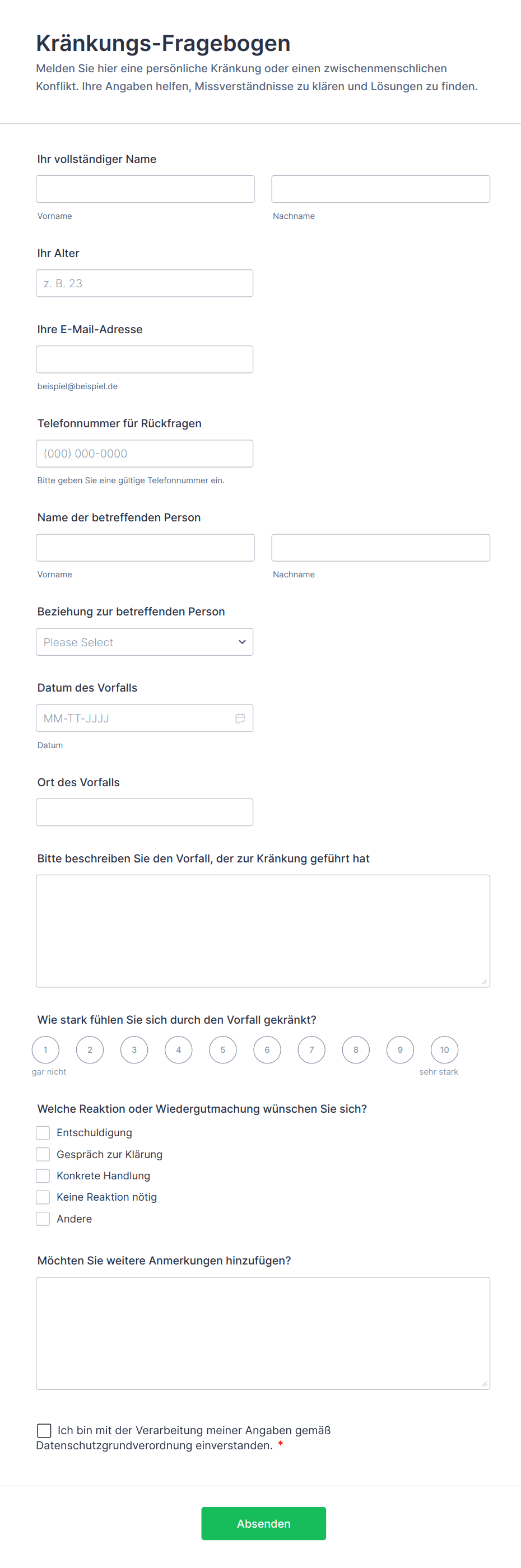 - Inhalt und Felder unterscheiden sich je nach Zielsetzung: So kann beispielsweise ein Fragebogen zur Gesundheitsvorsorge Angaben zur Krankengeschichte und Symptom-Checklisten enthalten, während ein Feedback Formular sich auf Zufriedenheitsbewertungen und offene Kommentare konzentriert.
