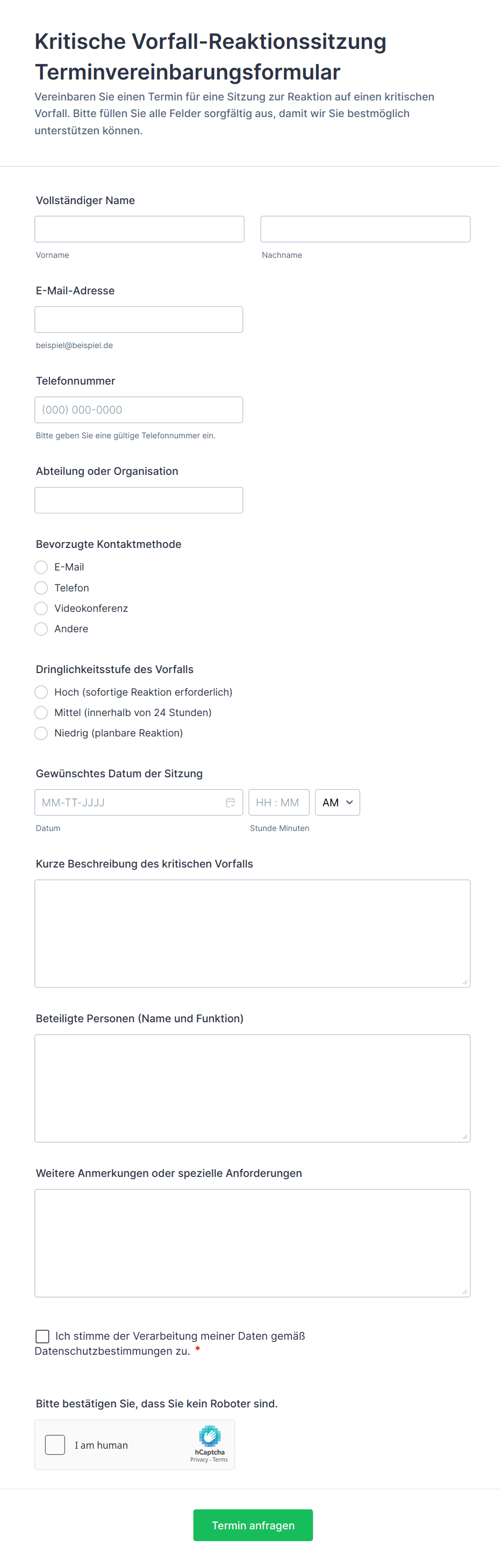 Terminformulare sind digitale Tools, die den Prozess der Terminplanung für Besprechungen, Beratungen, Interviews und jede andere Art von Termin zwischen Dienstleistern und Kunden optimieren. Sie werden häufig von Fachleuten im Gesundheitswesen, in Salons, Bildungseinrichtungen, von Beratern und in Unternehmen verwendet, die für ihre Dienstleistungen ein organisiertes Zeitmanagement benötigen. Durch das Erfassen wichtiger Informationen wie bevorzugte Termine, Uhrzeiten, Kontaktdaten und spezifischer Serviceanfragen tragen sie dazu bei, Terminkonflikte zu reduzieren, das Nichterscheinen zu minimieren und die Gesamteffizienz zu verbessern. Ganz gleich, ob Sie eine vielbeschäftigte Praxis leiten, Vorstellungsgespräche koordinieren oder persönliche Trainingseinheiten anbieten: Terminformulare bieten Ihnen eine strukturierte Möglichkeit, Ihre Termine zu verwalten.
