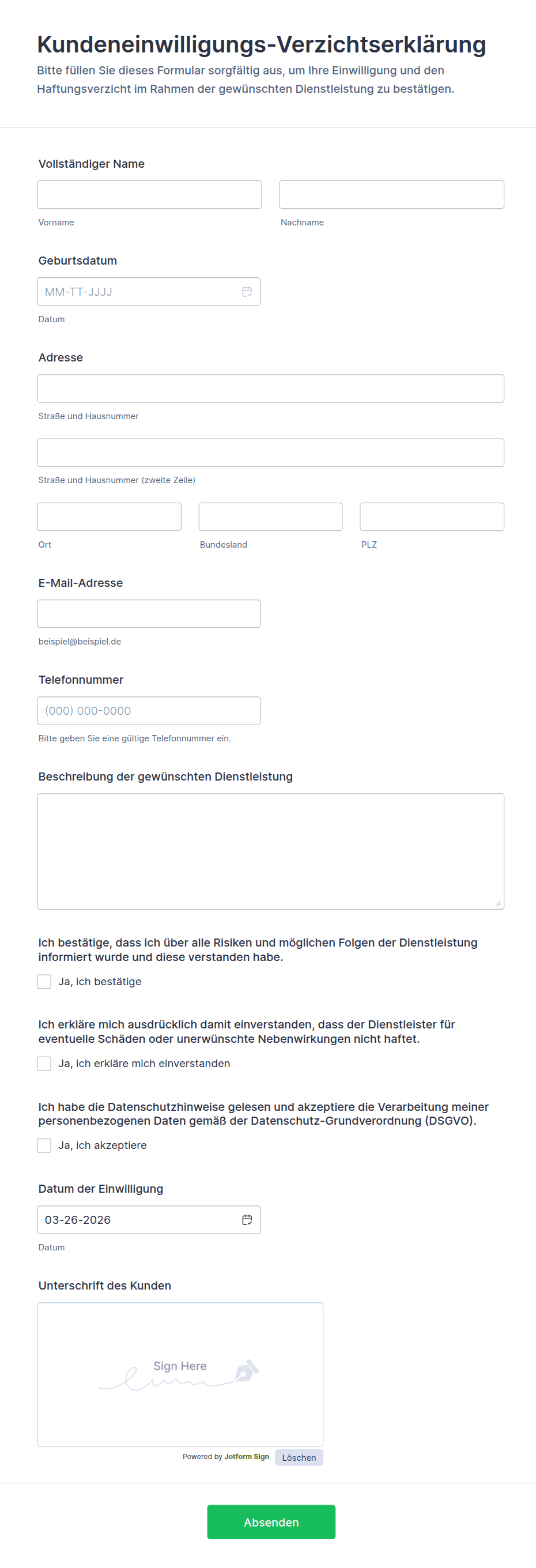 Mit Jotform erstellen und verwalten Sie Einverständniserklärungen mühelos. Gestalten Sie mit dem No-Code-Formulargenerator individuelle Erklärungen für Patientenaufnahme, elterliche Einwilligungen oder Datenverarbeitungsvereinbarungen. Die Drag-and-Drop-Oberfläche, anpassbare Vorlagen und Integrationen mit sicheren Speicher- und Benachrichtigungssystemen ermöglichen Ihnen, Einwilligungsantworten einfach zu erfassen, zu organisieren und abzurufen. Nutzen Sie erweiterte Funktionen, um Compliance sicherzustellen, Workflows zu optimieren und Unternehmen sowie Befragten ein professionelles Erlebnis zu bieten.