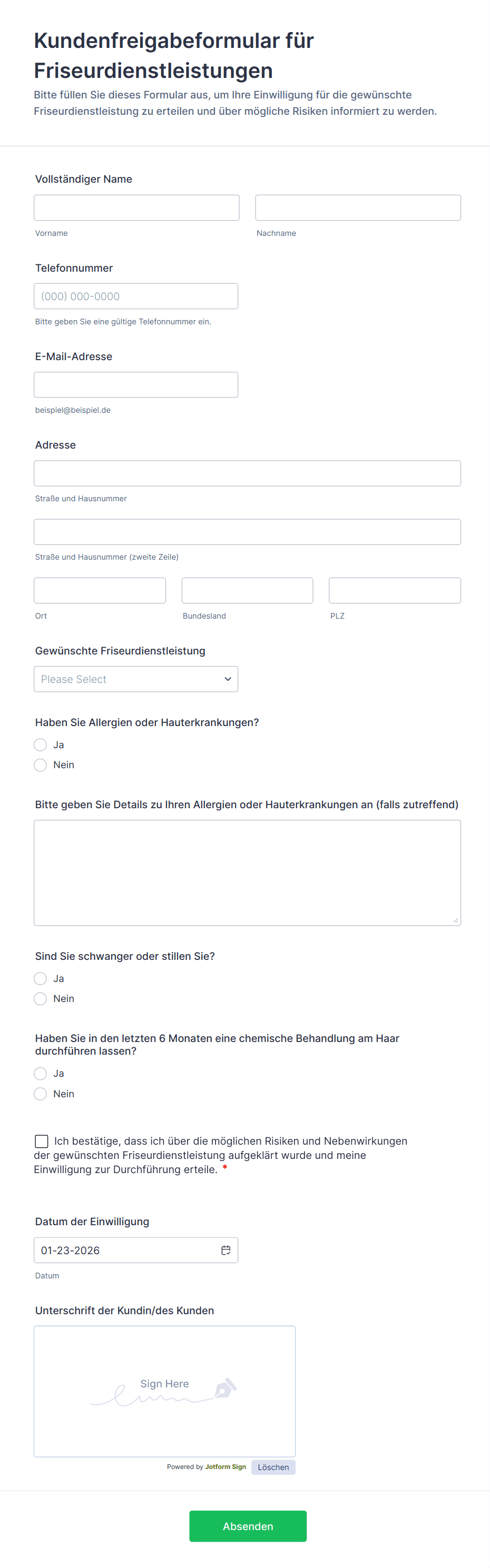 Mit Jotform erstellen und verwalten Sie Einverständniserklärungen mühelos. Gestalten Sie mit dem No-Code-Formulargenerator individuelle Erklärungen für Patientenaufnahme, elterliche Einwilligungen oder Datenverarbeitungsvereinbarungen. Die Drag-and-Drop-Oberfläche, anpassbare Vorlagen und Integrationen mit sicheren Speicher- und Benachrichtigungssystemen ermöglichen Ihnen, Einwilligungsantworten einfach zu erfassen, zu organisieren und abzurufen. Nutzen Sie erweiterte Funktionen, um Compliance sicherzustellen, Workflows zu optimieren und Unternehmen sowie Befragten ein professionelles Erlebnis zu bieten.