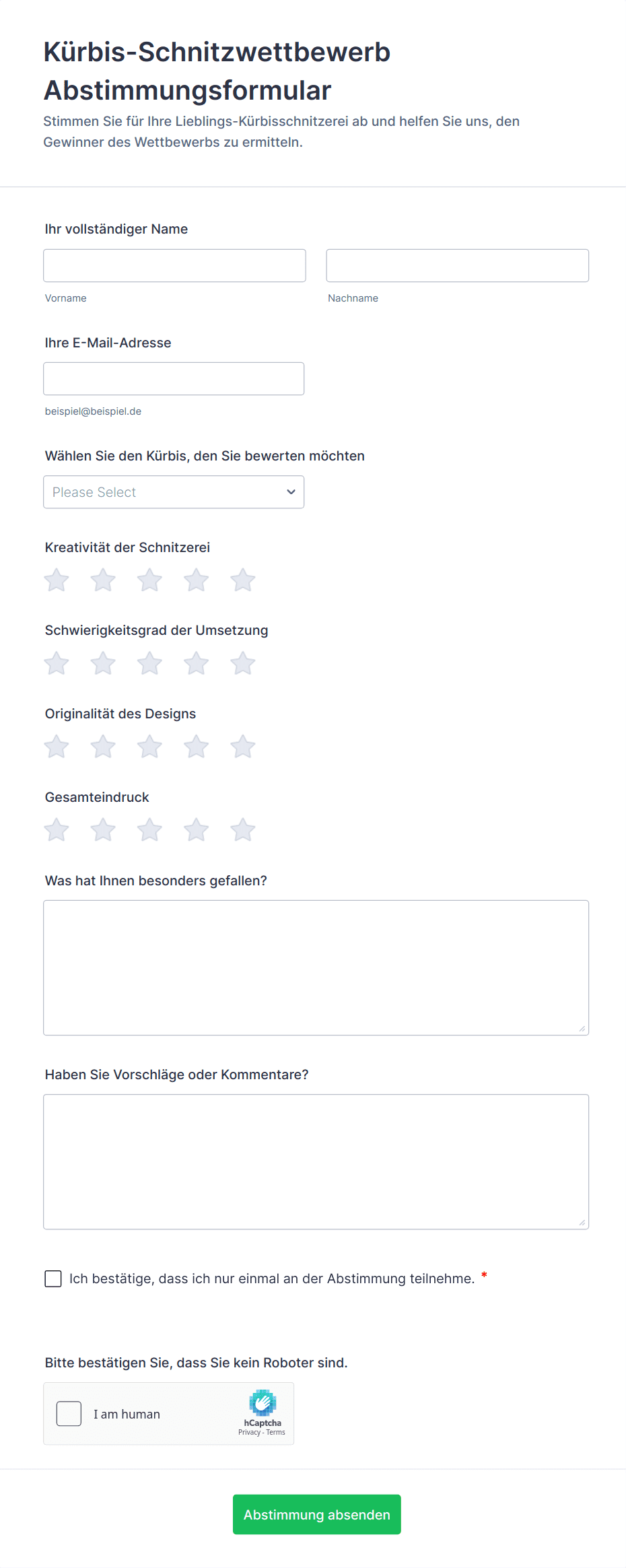 Abstimmungsformulare sind digitale Tools, die dazu dienen, Stimmen oder Präferenzen einer Gruppe von Teilnehmern zu sammeln, zu organisieren und zu analysieren. Sie werden häufig für Wahlen, Abstimmungen, Umfragen, Preisverleihungen, Veranstaltungsplanungen und Entscheidungsprozesse in Organisationen, Schulen, Vereinen und Gemeinden verwendet. Abstimmungsformulare optimieren den Prozess der Meinungserfassung, sei es für die Auswahl eines neuen Teamleiters, die Wahl eines Lieblingsprojekts oder die effiziente Entscheidungsfindung in Gruppen. Dank ihrer Vielseitigkeit eignen sie sich sowohl für formelle Wahlen als auch für informelle Meinungsumfragen und stellen sicher, dass die Stimme jedes Teilnehmers gehört und genau erfasst wird.