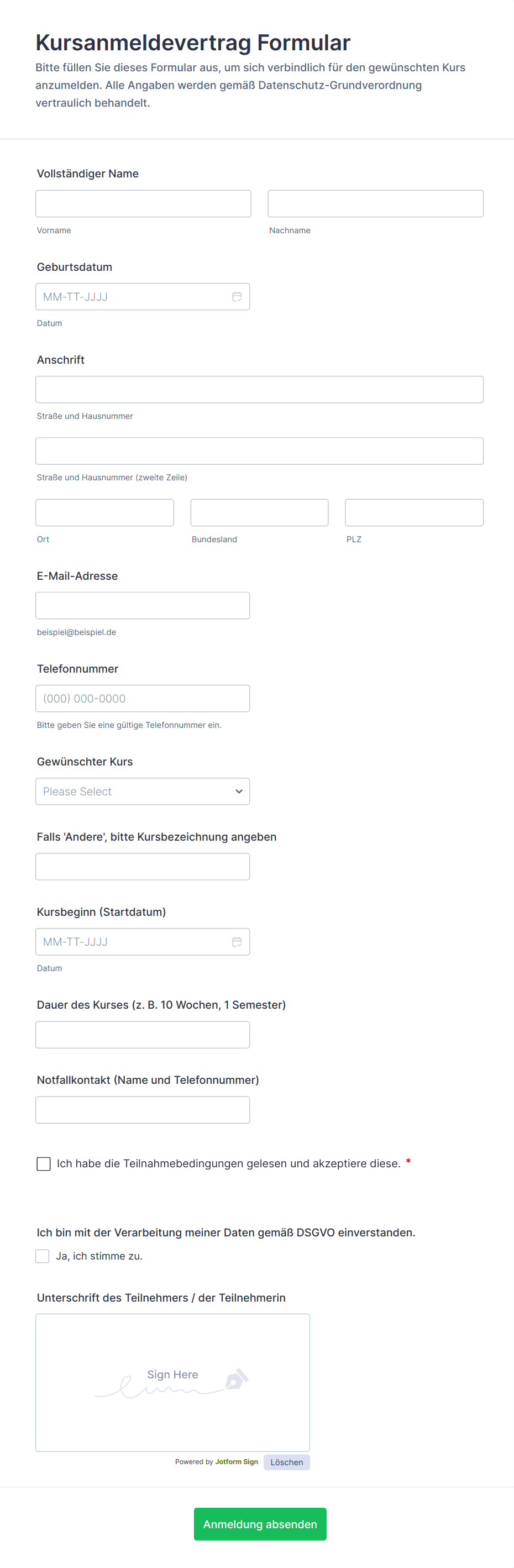 Eine Kursanmeldeformularvorlage ist ein vorgefertigtes Online-Formular zur Erfassung von Teilnehmerinformationen und zur Verwaltung von Einschreibungen für Bildungskurse, Workshops oder Schulungen.