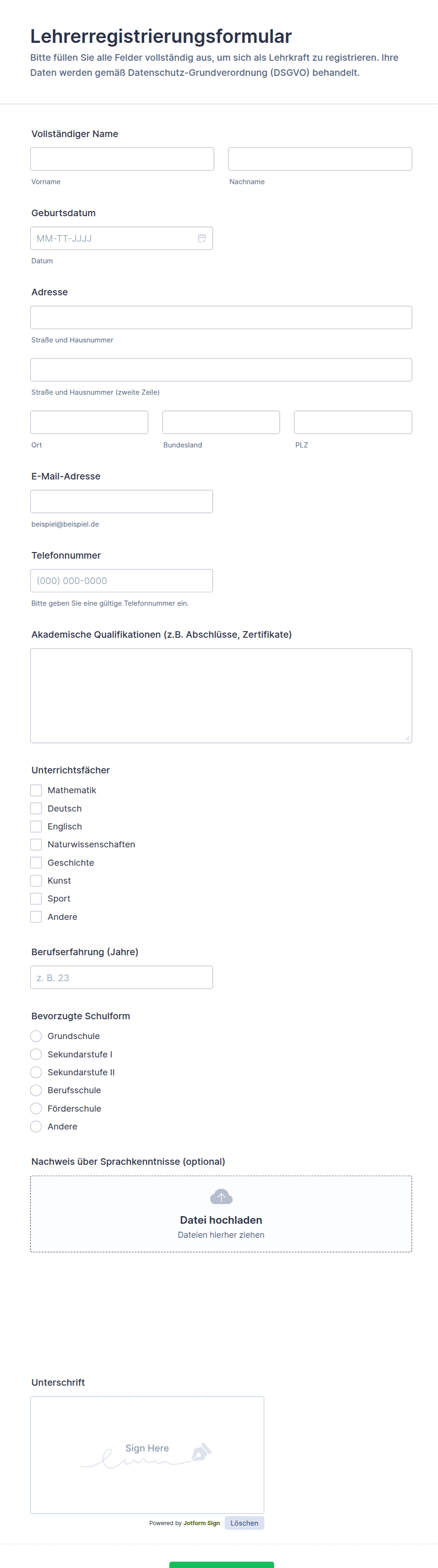 Ein Lehrerregistrierungsformular wird verwendet, um die Datenerfassung für neue Lehrkräfte zu vereinheitlichen, Kontaktdaten zentral zu sammeln und Informationen wie Unterrichtsfächer, Qualifikationen und Berufserfahrung vergleichbar zu machen.
