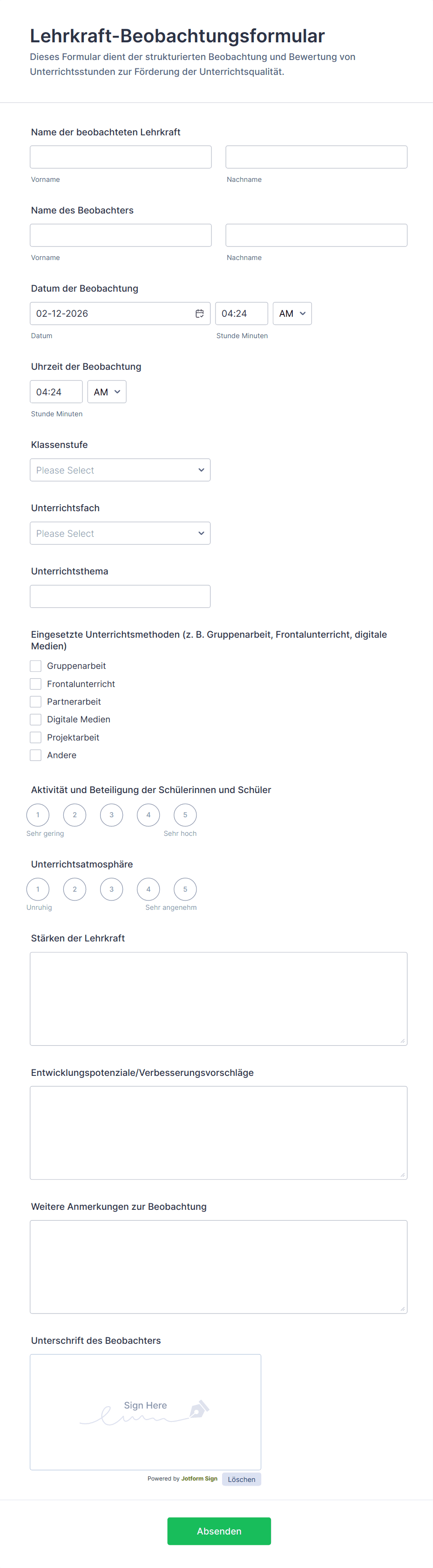Mit Jotform wird das Erstellen und Verwalten von Lehrerbewertungsformularen zum nahtlosen Prozess. Mithilfe des intuitiven Drag-and-Drop Formulargenerators können Benutzer Bewertungsformulare schnell an bestimmte Kriterien oder institutionelle Standards anpassen — ganz ohne Programmierkenntnisse. User können aus einer Vielzahl von Vorlagen auswählen oder ihre eigenen Formulare erstellen und dabei Funktionen wie bedingte Logik, Bewertungsskalen, Kommentarfelder und automatische Benachrichtigungen integrieren. Alle Antworten werden sicher gespeichert und sind für die Analyse leicht zugänglich. So können Sie den Fortschritt einfach verfolgen, Trends erkennen und die kontinuierliche Weiterentwicklung der Lehrer:innen unterstützen.