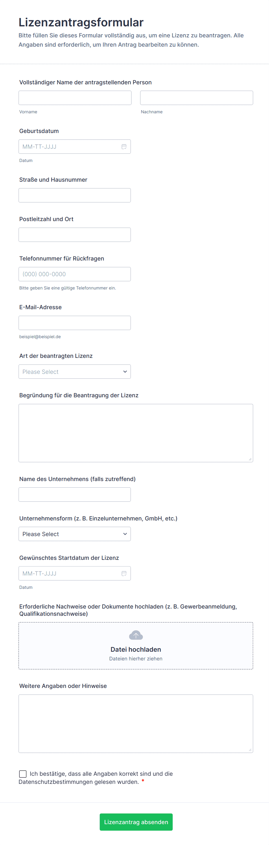- Zulassungs- und Lizenzformulare: Erfordern oft detaillierte persönliche Angaben, den Upload von Dokumenten, Erklärungen und digitale Signaturen.
