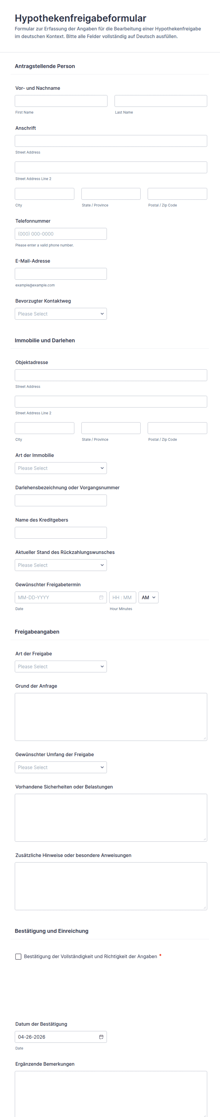 - Hypothekenformulare enthalten Angaben zur Immobilie, Informationen zur Anzahlung und Abschnitte für Mitantragsteller