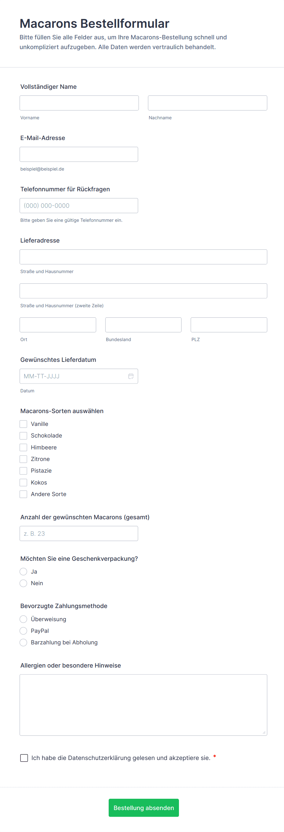 Zu den wichtigen Feldern gehören Kundenkontaktdaten, Produktauswahl, Menge, Abhol- oder Lieferdatum, Zahlungsmethode und eventuelle Anpassungen oder besondere Anweisungen.