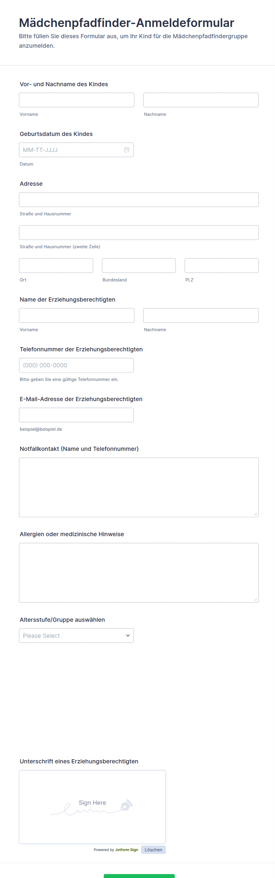Sammeln Sie Anmeldungen für Mädchenpfadfindergruppen online und erfassen Sie Kontaktdaten, Gruppenzuordnung und Einverständnisse zentral, damit Leitungsteams neue Mitglieder schneller aufnehmen und koordinieren können.