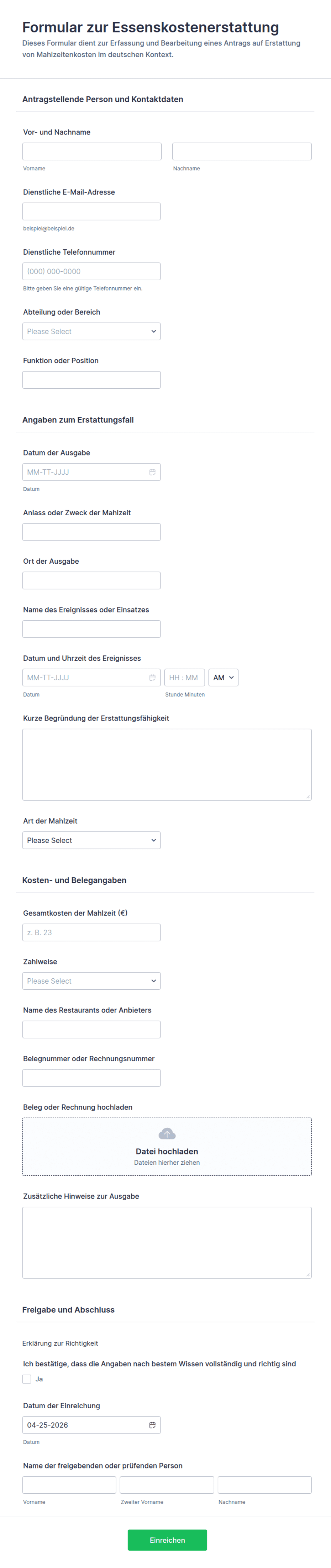 Vorlagen für Kostenerstattungsformulare sind spezielle digitale Formulare, die den Prozess der Erfassung, Prüfung und Genehmigung von Spesenabrechnungen von Mitarbeitern optimieren sollen. Diese Vorlagen werden häufig von Unternehmen, Non-profit Organisationen, Bildungseinrichtungen und anderen Organisationen verwendet, um detaillierte Informationen über die Ausgaben ihrer Mitarbeiter zu sammeln, z. B. für Reisen, Verpflegung, Büromaterial oder Kundenbewirtung. Durch die Standardisierung der Aufnahme tragen diese Formulare dazu bei, dass alle erforderlichen Unterlagen – wie Belege, Daten und Ausgabenkategorien – effizient erfasst werden, wodurch Fehler reduziert und Erstattungszyklen beschleunigt werden. Die Use Cases reichen von einfachen einmaligen Spesenabrechnungen über laufende monatliche Einreichungen und die Erfassung von Abteilungsausgaben bis hin zu projektbezogenen Erstattungen.