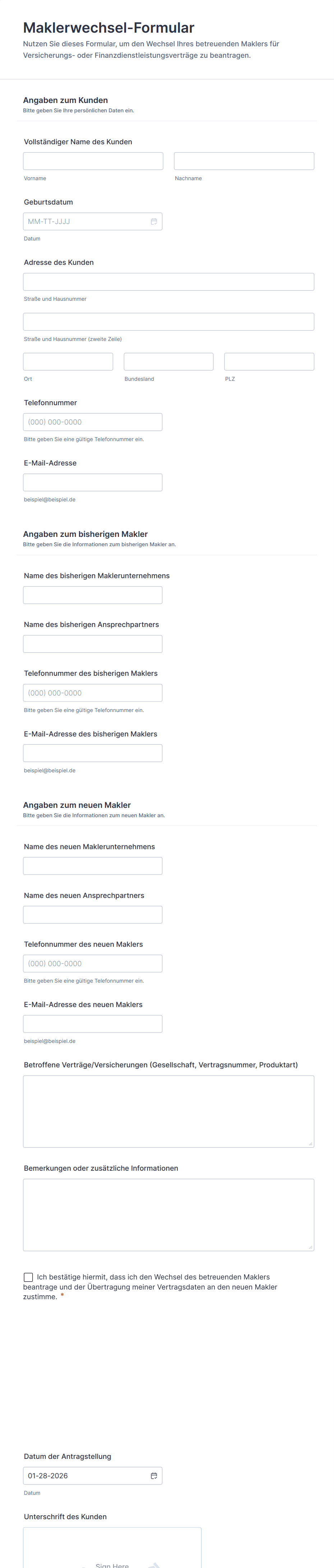 Ein Maklerformular ist ein digitales Dokument, das von Maklern verwendet wird, um Informationen zu Kunden, Transaktionen, Immobilien oder Policen zu erfassen, zu verarbeiten und zu verwalten. Es optimiert die Datenerfassung und gewährleistet die Compliance mit Branchenstandards.