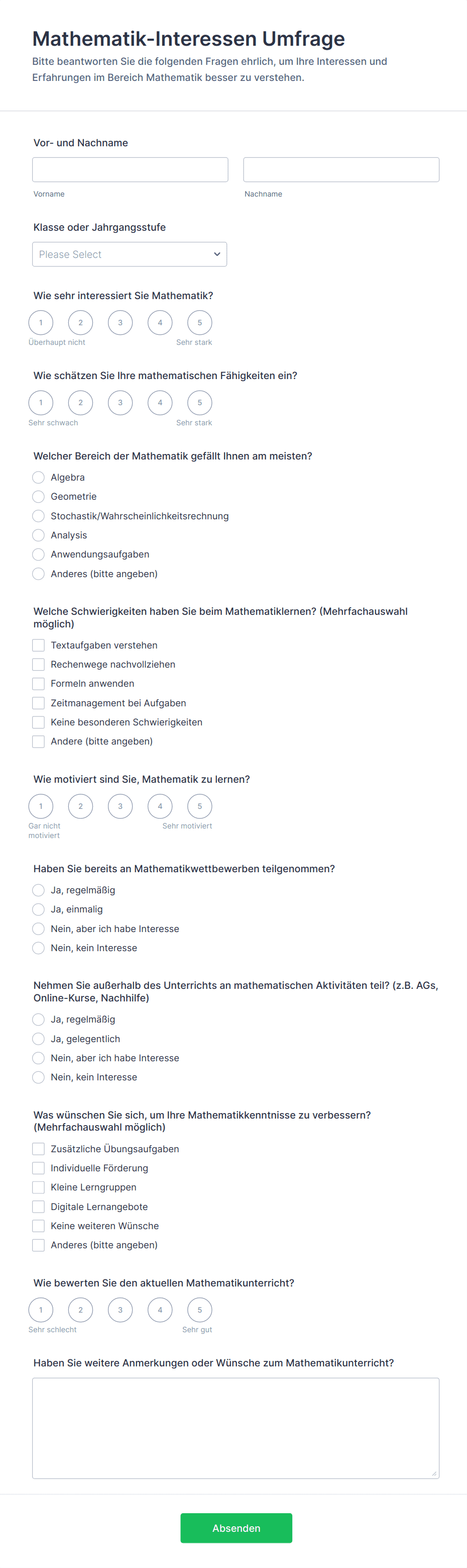 - Für Elternumfragen: Fügen Sie Zufriedenheitsbewertungen, Feedback zur Kommunikation und Verbesserungsvorschläge hinzu.