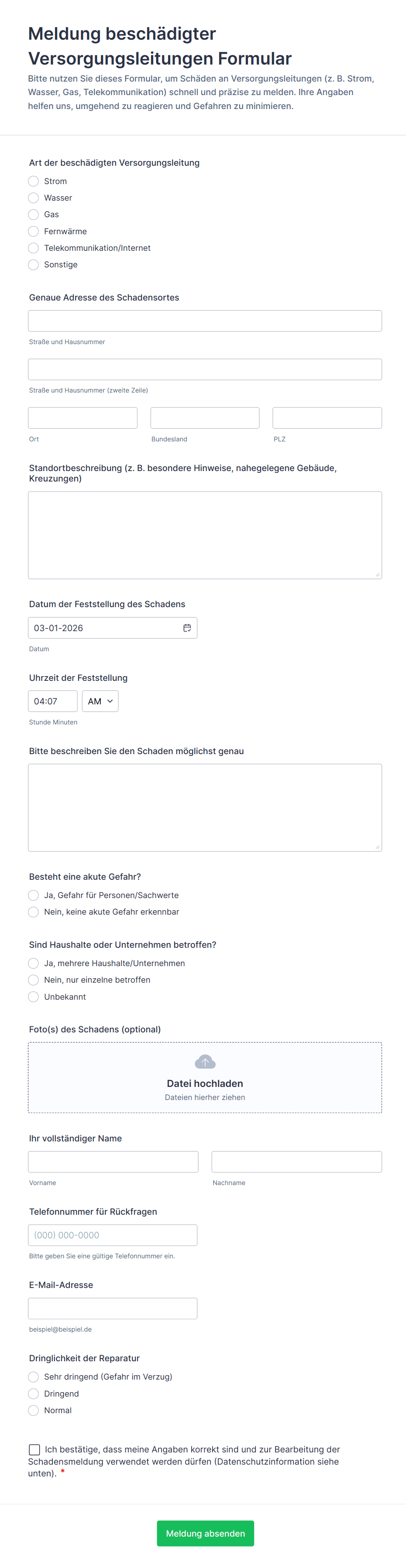 Fügen Sie Felder für die Problembeschreibung, die gewünschte Änderung, betroffene Dienste, die Dringlichkeit sowie mögliche Abhängigkeiten oder Einschränkungen hinzu. Ergänzen Sie Upload-Felder für Diagramme oder Fotos.