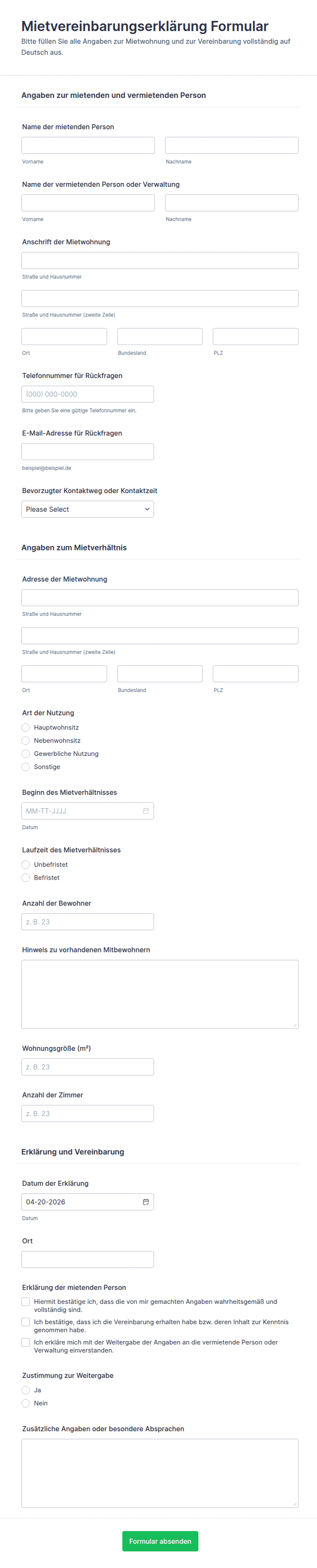 - Mieterselbstauskunft: Name, Kontaktdaten, Beschäftigungsdetails, Referenzen, Einverständniserklärungen.