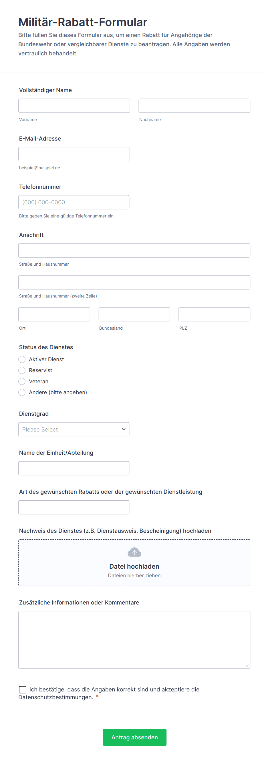 Ein Antragsformular ist ein strukturiertes Dokument oder Online-Formular, das dazu dient, Informationen von Personen zu erfassen, die eine Dienstleistung, eine Ressource, eine Genehmigung oder Support beantragen möchten. Es standardisiert die Art und Weise, wie Anträge eingereicht und verwaltet werden.